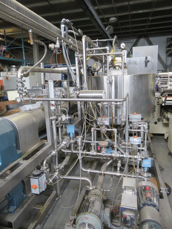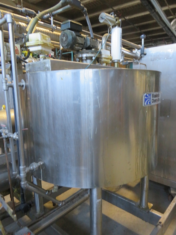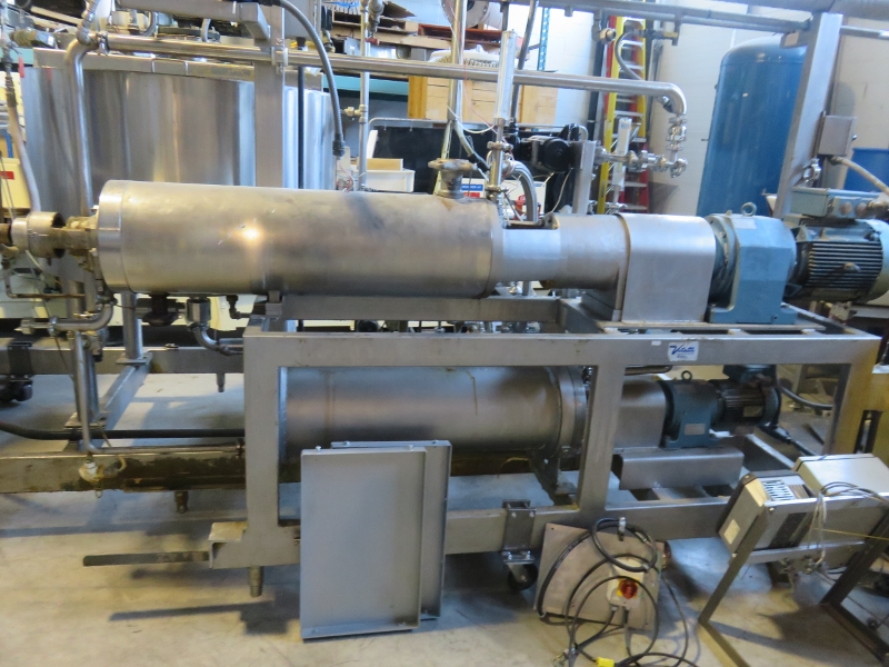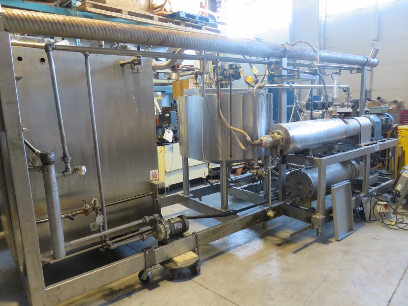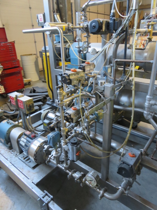 1-Used Waukesha/Cherry Burrell 3,000 Lb./Hr. Votator Shortening System. This skid mounted System has both “A” Heat Exchanger and “B” Pin Rotor Exchanger, each measuring 6 in. Diameter X 48 in. Long. “A” Exchanger rated 600 PSI internally @ 100 Degrees F and 300 PSI jacket @ 130 degrees F, National Board and Code Stamped. Manufacturer S/N A6587. “B” Pin Rotor Exchanger rated shell 600 PSI@ 125 PSI, Manufacturer serial number B904, National Board Stamped. System has Main Enclosure Control Panel, S/N 19900 and features 200 Gallon Stainless Steel Jacketed Mix Tank (125 psi jacket rated). With Allen Bradley “PanelView 1000” Controller, interconnecting stainless piping, pumps, etc. (Stock # 8334)