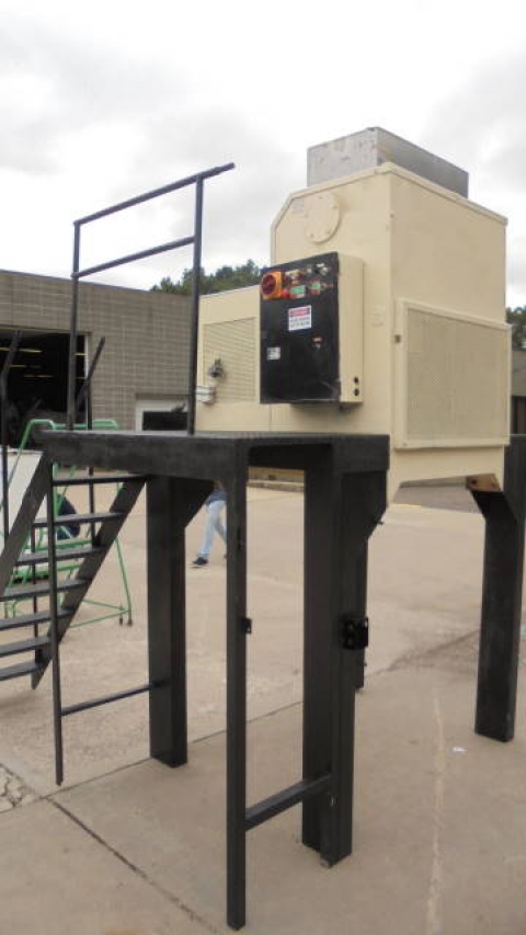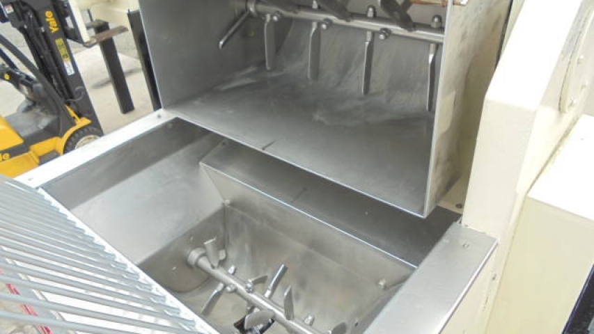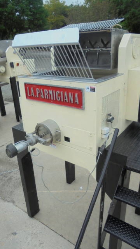 1-Used La Parmigiana D100S.PV.SD Pasta Extruder, S/N 1096. Rated up to 100 kg. per hour (approx. 220 pounds per hour), Extruder has two (2) stainless steel kneading hoppers measuring approx. 16 in. wide X 31 in. long X 26 in. deep (top hopper) and bottom hopper measuring approx. 19 in. wide X 33 in. long X 20 in. deep. Each with hinged safety grates. This Extruder is supplied with miscellaneous Dies for different pasta shapes. Equipped with motorized cutting head, extruder is mounted on stand/mezzanine with staircase (Stock # 8223D)
