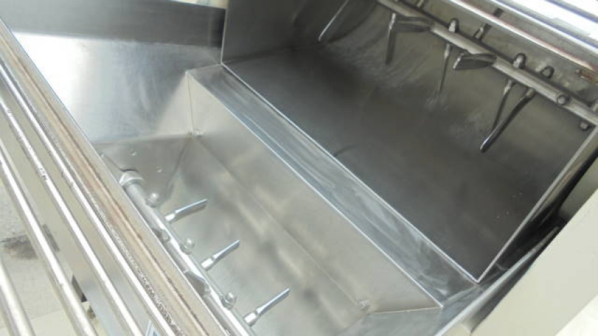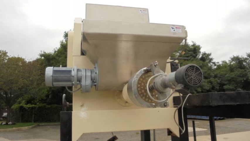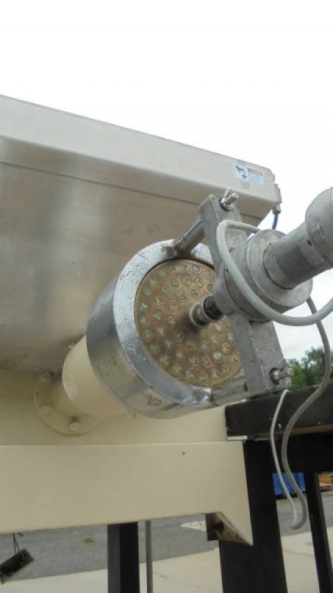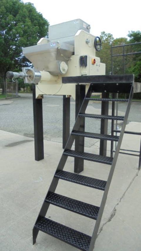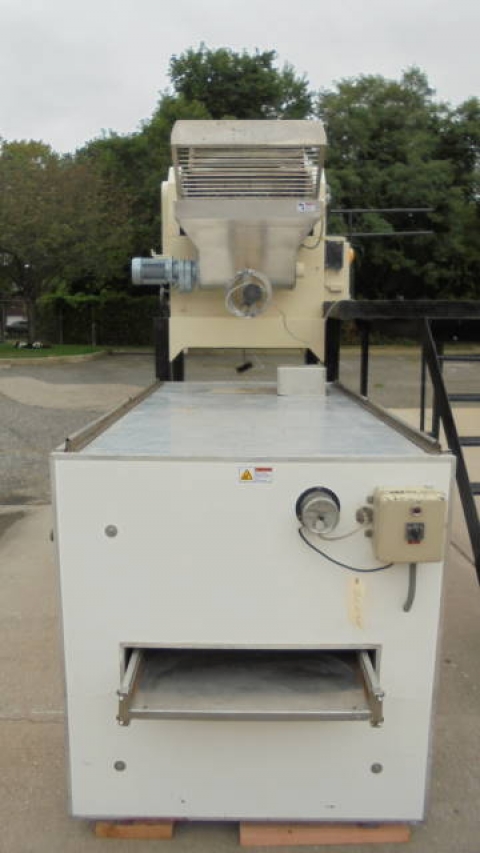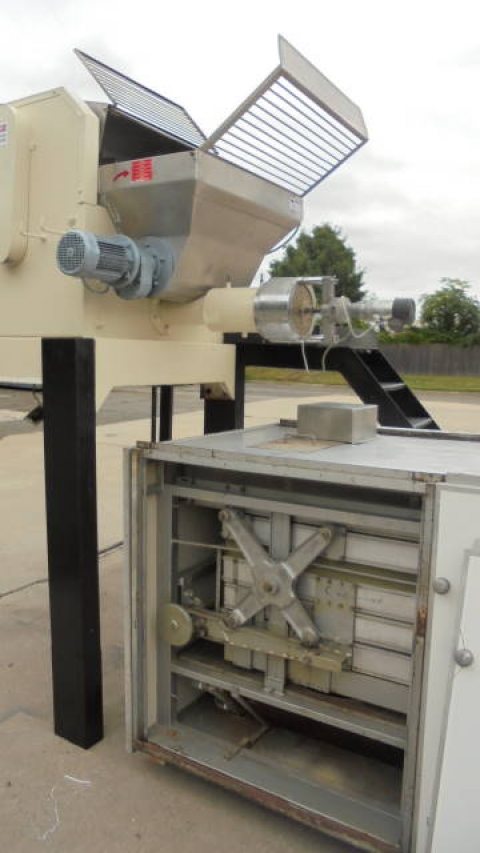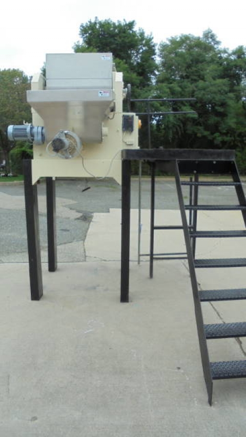 1-Used La Parmigiana D80S.TE.VE Pasta Extruder, S/N 1172. Rated up to 80 kg. per hour (approx. 175 pounds per hour), Extruder has two (2) stainless steel kneading hoppers measuring approx. 14 in. wide X 30 in. long X 22 in. deep (top hopper) and bottom hopper measuring approx. 16 in. wide X 33 in. long X 19 in. deep. Each with hinged safety grates. This Extruder is supplied with miscellaneous Dies for different pasta shapes. Equipped with motorized cutting head,this Extruder is mounted on stand /mezzanine with staircase. Can also be supplied with Trabatto Shaker/Pre-Dryer shown in photographs at additional cost. (Stock # 8223C)