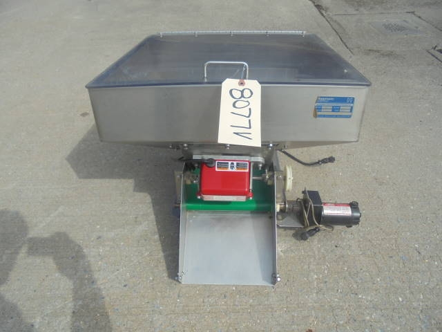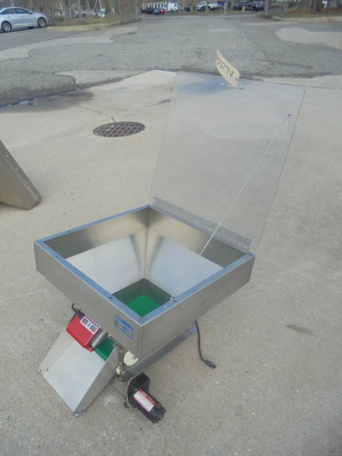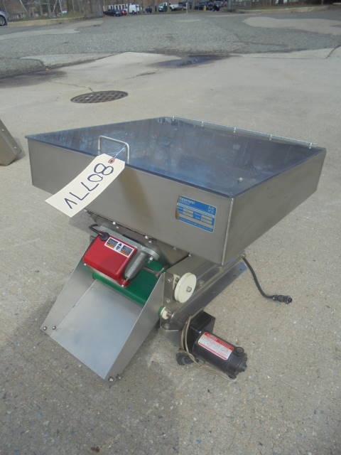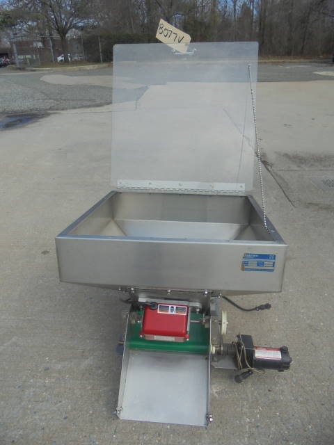 1-Used Hoppmann Stainless Steel Vibratory Feeder/Hopper, Model “LB”, S/N 11239. With stainless steel hopper measuring approx. 23 in. X 24 in., Feeder has 90 volt DC motor. With hinged plexiglass lid. (Stock #8077V)