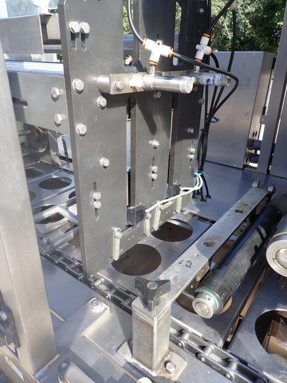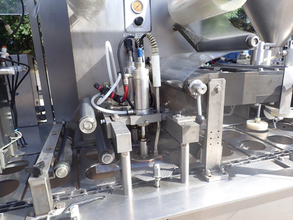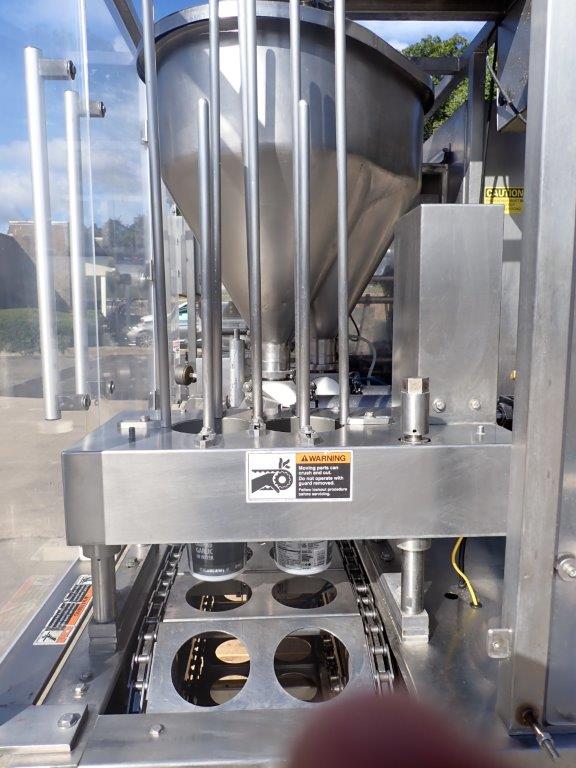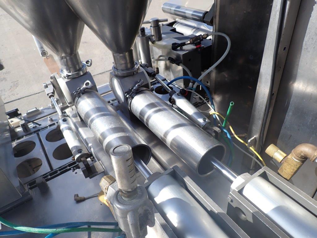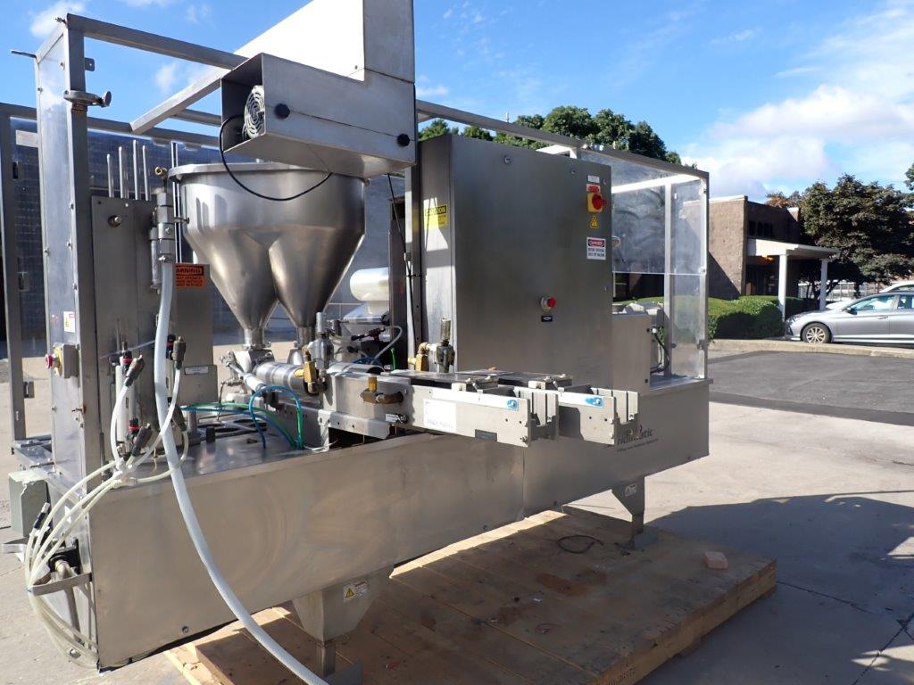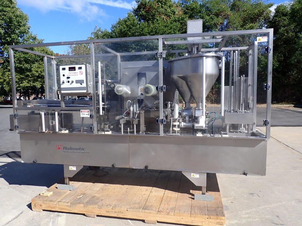 1-Used Packaging Technologies Holmatic Model PR-2 Dual Lane Automatic Cup Filler/Sealer/Overcapper, S/N 15395.  With stainless steel framework, machine is equipped with dual head piston filling head, with each piston measuring approximately 3-1/2 inch diameter by 14 inch long.  Filler is equipped with tooling for 4-1/2 inch diameter round cups and was last used in packaging of food products. With container denesting magazine, filler has dual stainless steel agitated hopper with lid.  Electrical specifications single phase, 60 cycle, 220 volt. (Stock #8674F)