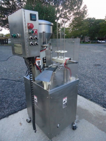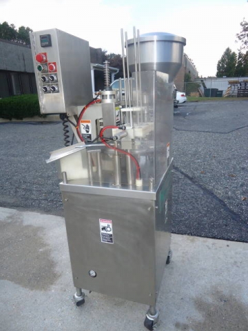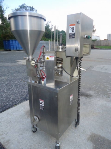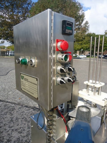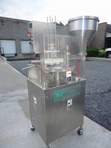 1-Used modern packaging/winpak model sr6dc rotary cup filling/sealing machine, s/n mp330. On casters for portability, machine has stainless steel cabinetry, cup and seal mezzanine and approx. 14 in . Diameter stainless steel top mounted product hopper. With stainless steel control panel/starter box, filler is presently tooled for approx. 3 in . Diameter cup. (stock # 7522b)