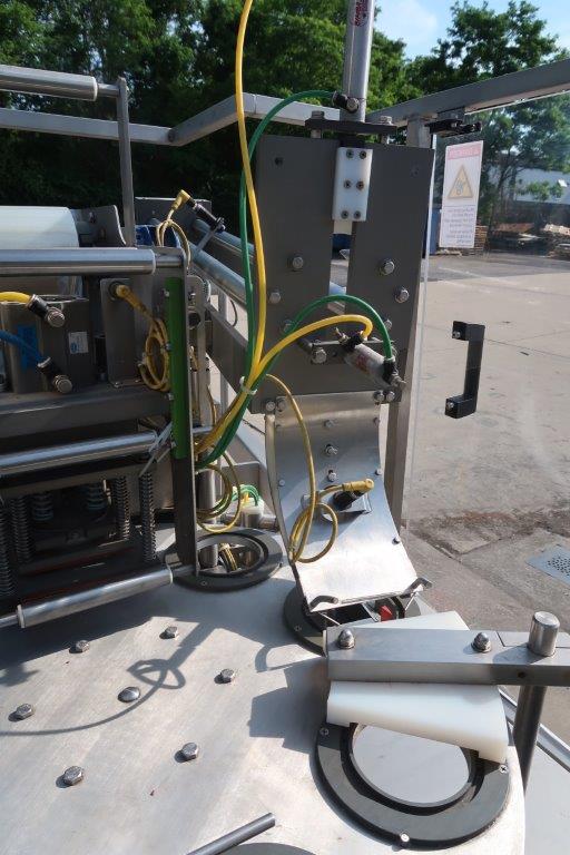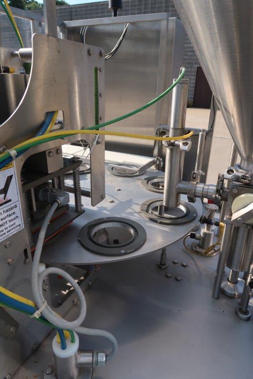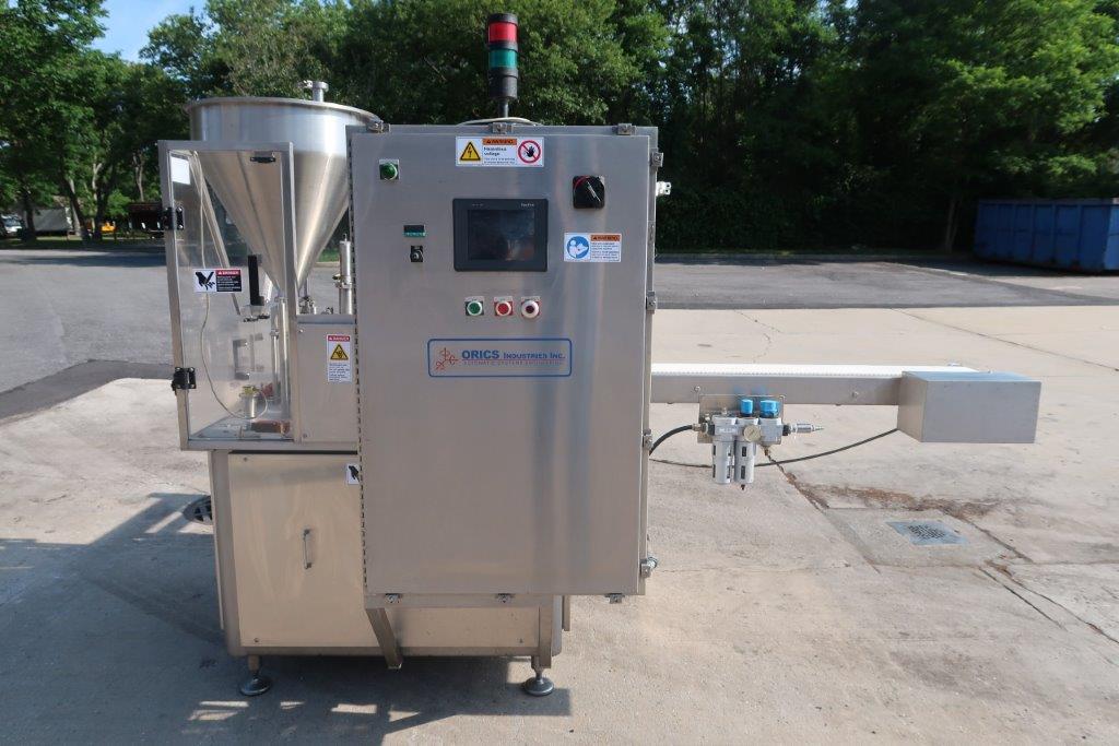 1-Used Orics Model R50XI Stainless Steel Rotary Cup Filling, Sealing and Lidding Machine, Serial number SFC-3520.  This stainless steel filler is equipped with tooling for approx. 4-1/4 In. diameter cups, and has motorized lid magazine. Rated up to 50 cups per minute (3,000 cups per hour), machine has control panel with “Easy View” screen. With top mounted stainless steel conical product hopper with lid, machine has 74 inch long integrated takeaway conveyor with plastic chain.  Last filling chunky food products, machine has approximately 2 inch diameter fill nozzle suitable for handling large particulates if needed.  Product piston measures approximately 3 inch diameter (Stock#8759B)