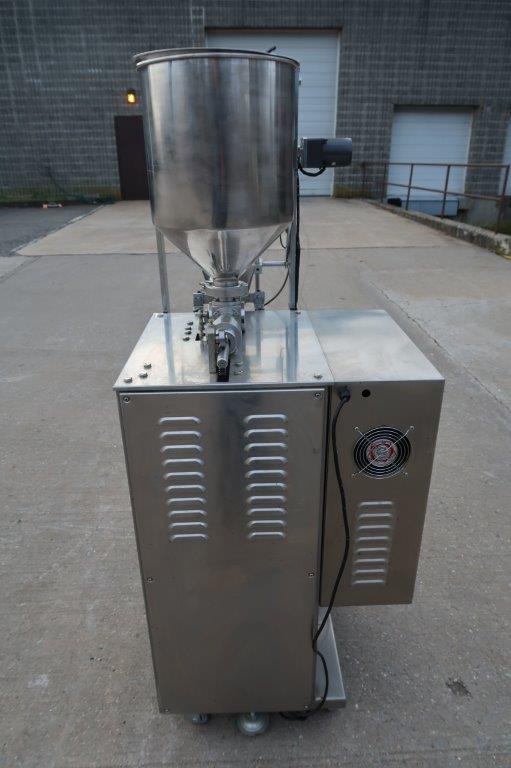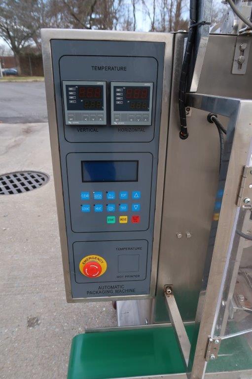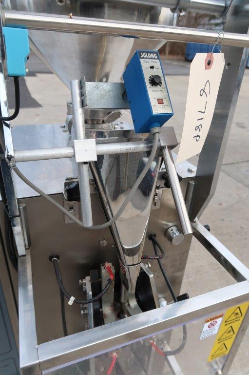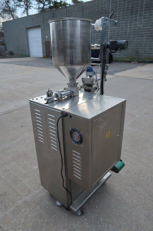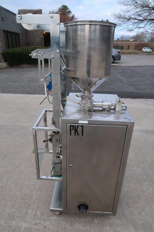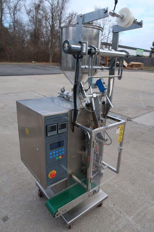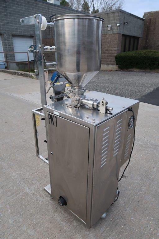 1 – Used Automatic Model DXDL8OC Stainless Steel Form, Fill and Seal machine. Designed for packaging small packets/pouches of creams, lotions, sauces and other similar viscous products. Equipped with 12 In. diameter top product hopper, this pouching machine has horizontal piston/cylinder combination, and front mounted control panel with temperature sealing gauges. On casters for portability, machine has 4-1/2 In. wide takeaway conveyor. (Stock # 8718P)