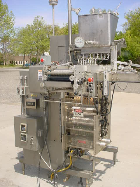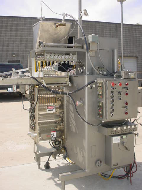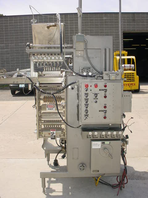1-USED CIRCLE MODEL V12H6C LIQUID/CREAM FORM/FILL/SEAL POUCHING MACHINE, S/N 345. EQUIPPED WITH STAINLESS STEEL JACKET, TOP MOUNTED HOPPER, THIS POUCHING MACHINE HAS EIGHT (8) HORIZONTALLY MOUNTED STAINLESS STEEL PISTONS EACH MEASURING APPROX. 1/2" DIAMETER X 7" LONG. EQUIPPED WITH ELECTRIC EYE FOR PRINT REGISTRATION. ELECTRICAL SPECIFICATIONS: 3/60/220-440 VOLT. EQUIPPED WITH PRINTING/CODING ATTACHMENT.