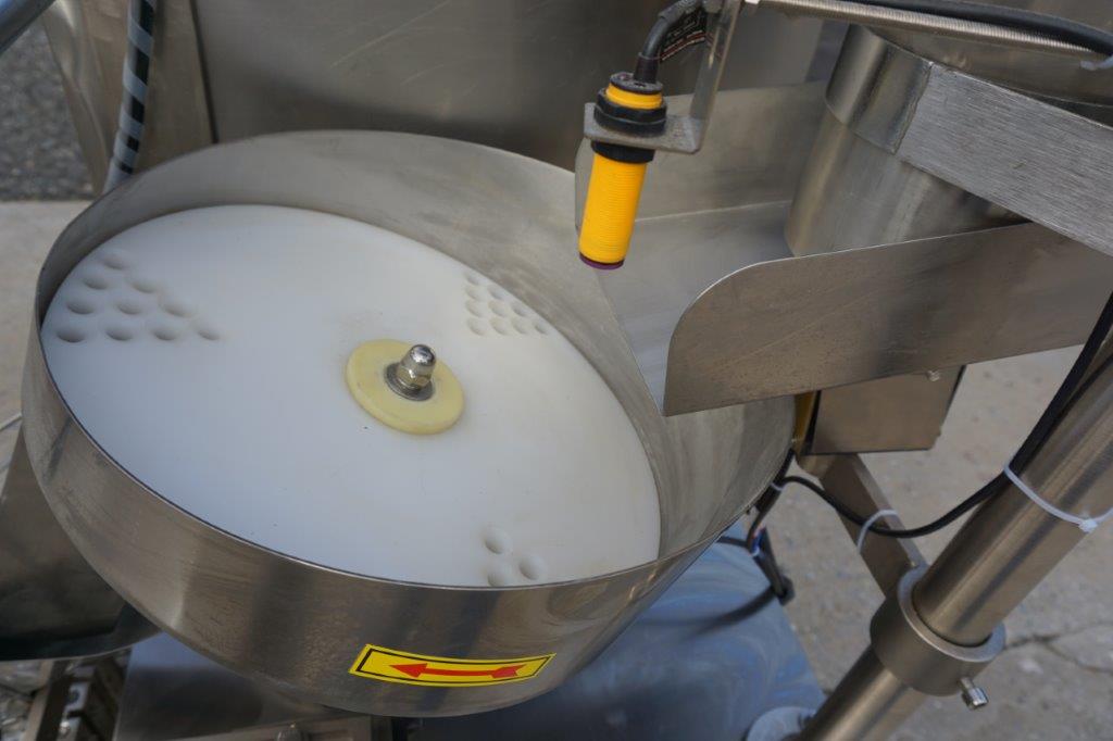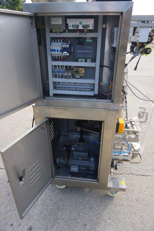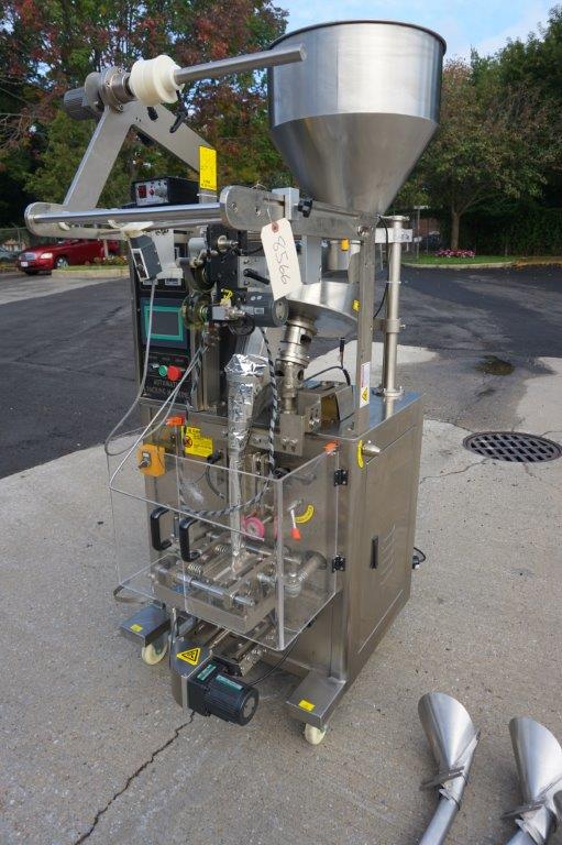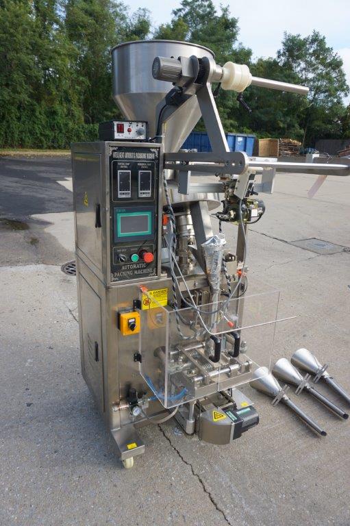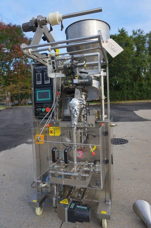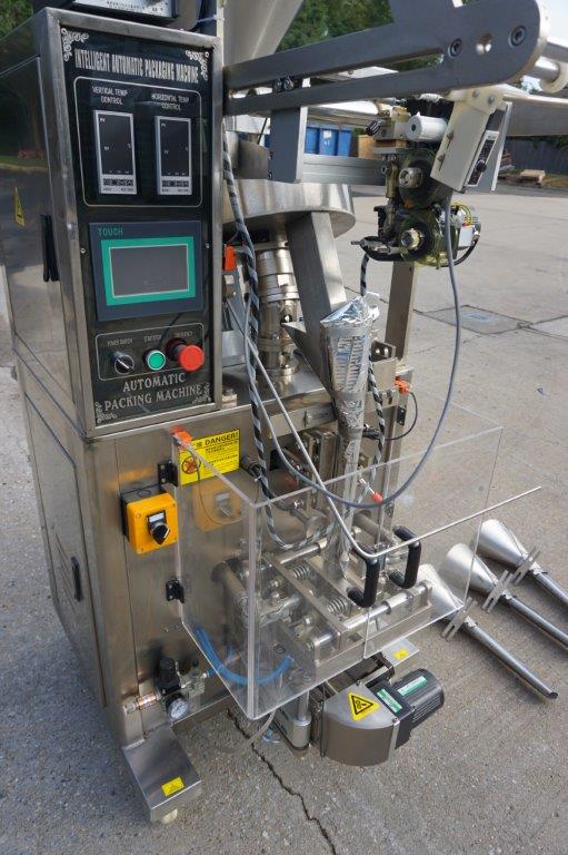 1- Used Intelligent Packaging Vertical Form , Fill, and Seal Machine. Last used for packaging small candies, machine has top mounted product Hopper, Vibratory feeder and Bowl feeder. With stainless steel cabinetry, machine has coding/printing attachment, vertical and horizontal sealing gauges, and comes equipped with three additional bag formers. On casters for portability, electrical specifications single phase, 230 volt. Equipped with YF-165L touch screen control pad. (Stock # 8566)