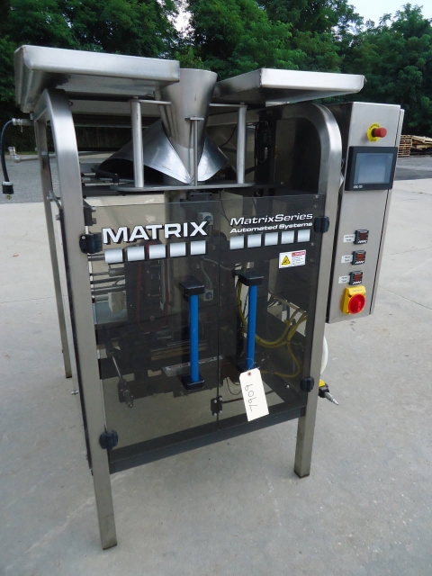 1-Used Matrix Packaging Machinery, Inc. Model 916 Vertical Form/Fill/Seal Machine Model 900915WXXRIX, S/N 500100MSB04670. With stainless steel framework, machine was last used in a food manufacturing facility and comes equipped with one Forming Collar and CTC Parker Automation Digital Screen.  Rated up to approx. 60 bags per minute maximum speed, this unit has air jaw sealing and can handle bags from 1.75” up to 9” wide and from 2.5” up to 15” long.  Supplied with top mounted auger filling head with hopper. Electrical specifications 3/50-60/230 volt. ( Stock #7909)
