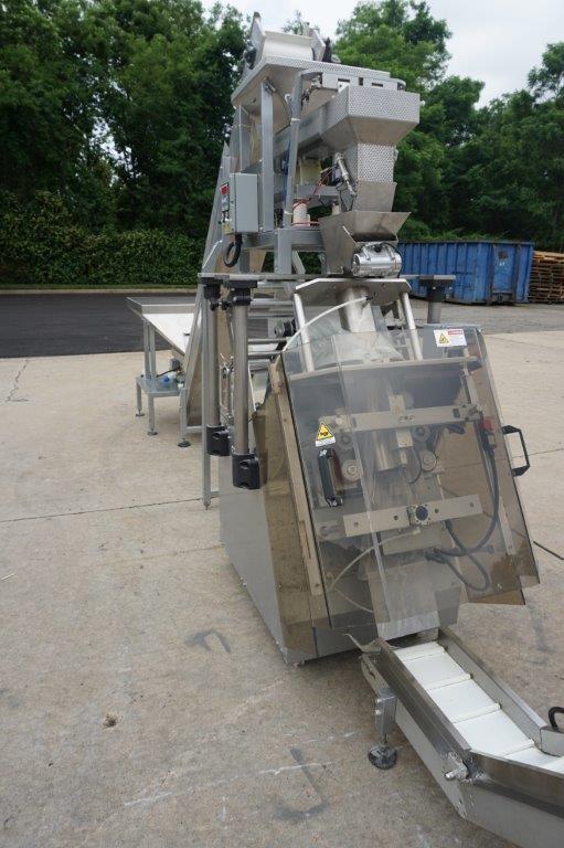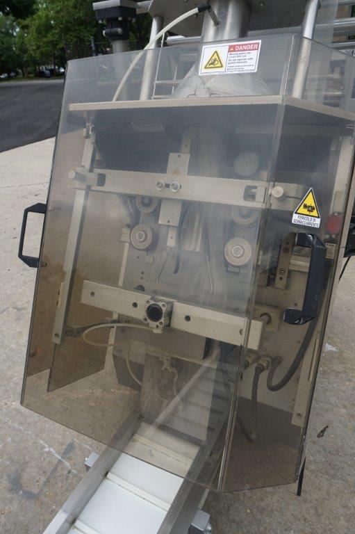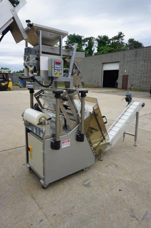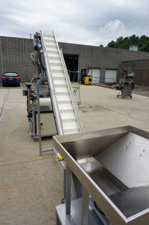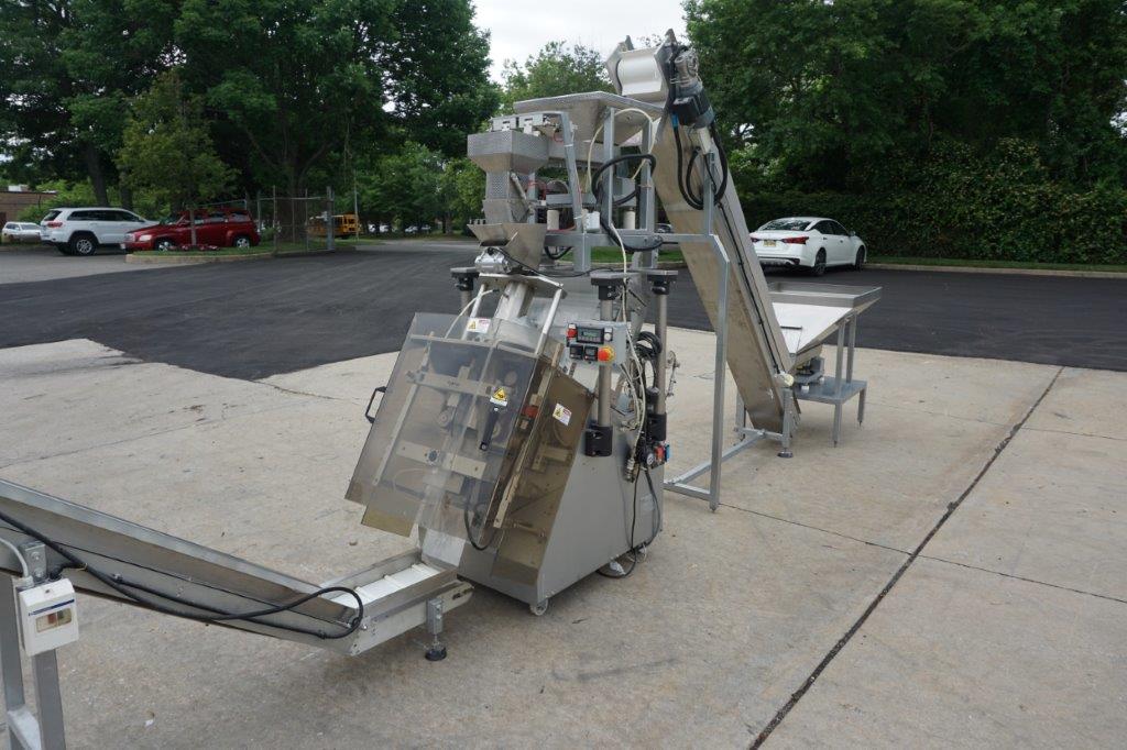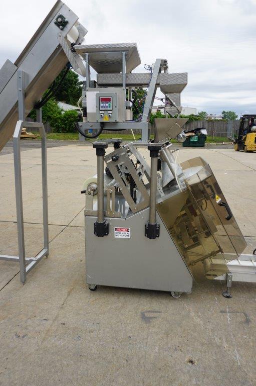 1 – Used Mondial Pack, Model MV100 – Small, Form, Fill and Seal Machine, Machine Number 858/04. System equipped with 31 inch X 31 inch stainless steel rigidized vibratory feed hopper with scale. With inclined cleated feed elevator, MV100 small bagger/sealer and 8 inch wide motorized take-away conveyor for finished bags. Last used in packaging frozen pasta, system has single phase 220 Volt electrics. (Stock # 8515)