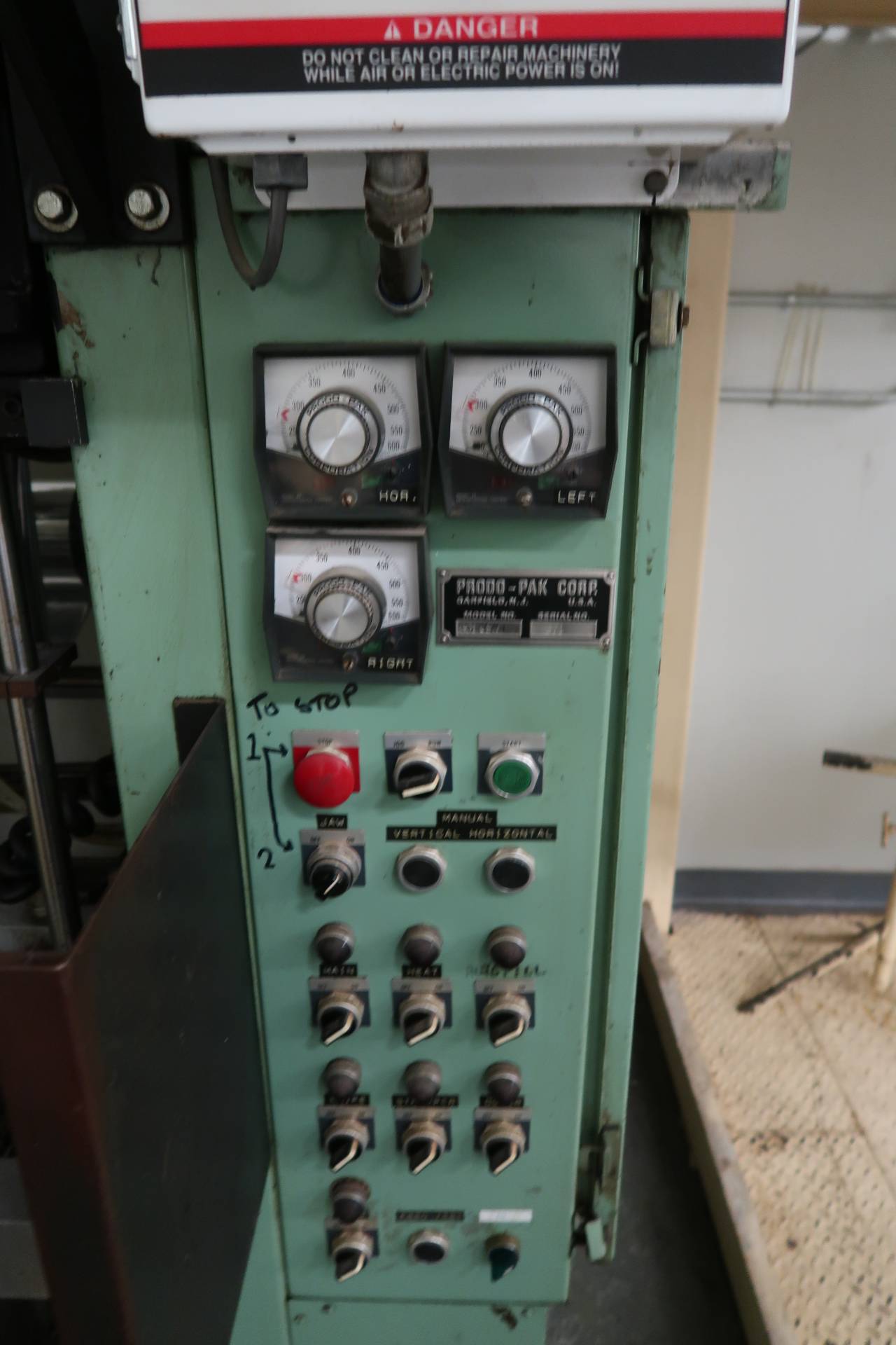 1-Used Prodo-Pak Model 601CSW-1 Vertical Form/Fill/Seal Machine, S/N 871.  Equipped with top-mounted All Fill auger powder filling head, machine has side mounted control panel.  (Stock #L1413)