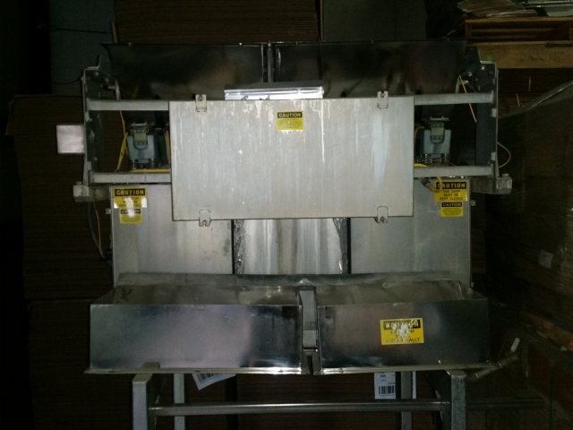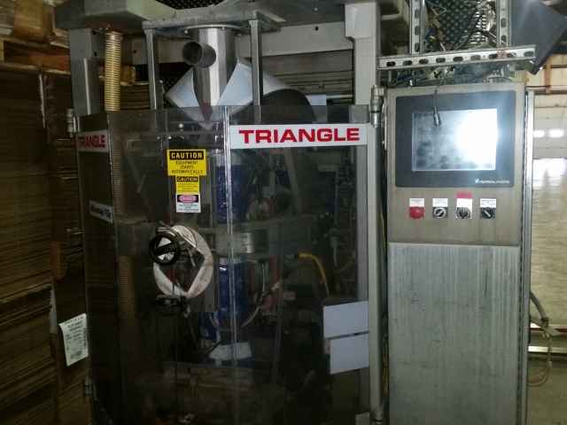 1-Used Triangle Intermittent Motion Vertical Bagger. Equipped with nine (9) Scale Buckets with eighteen (18) Holding Chambers. Machine last used for filling frozen food products. Rated up to 45 bags per minute, machine last packaging 3 pound IQF products and is equipped with spare forming tubes for 4 pound and 16 ounce bags. With upgraded controls, machine has been maintained well. (Stock #L1275)