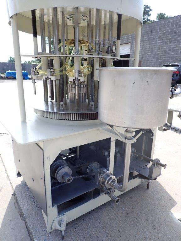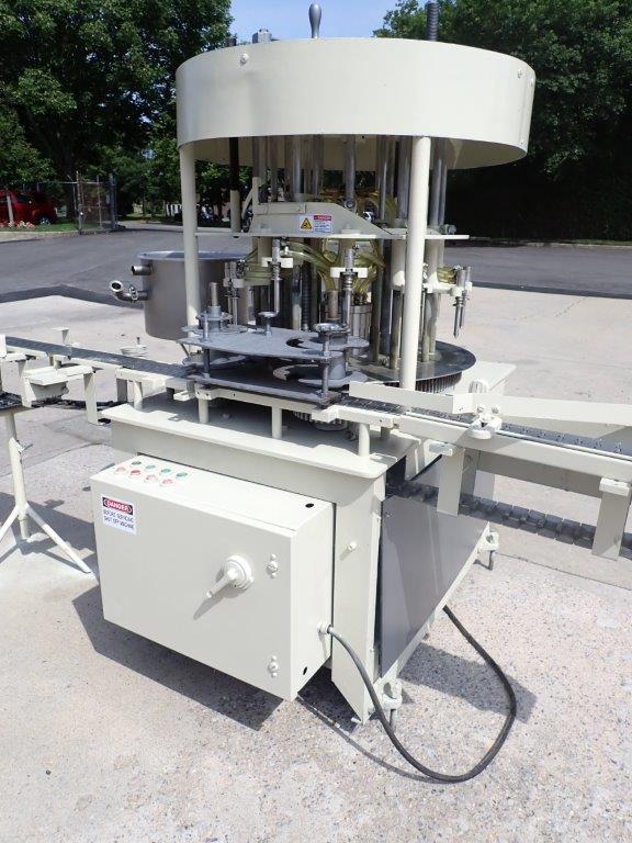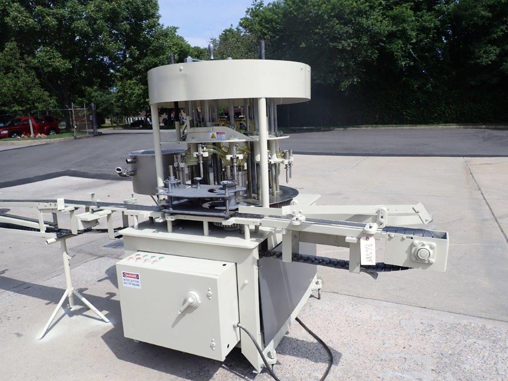 1-Used New Way 12 Spout Rotary Pressure Gravity Liquid Filling Machine. Equipped with approximately 5/8 In. diameter stainless steel pressure gravity spouts, filler has 8-1/2 In. centers “spout to spout” enabling filler of large containers. With Stainless Steel Sanitary Centrifugal pump with stainless product feed tank, filler has electric drive motor. (Stock #8658F)