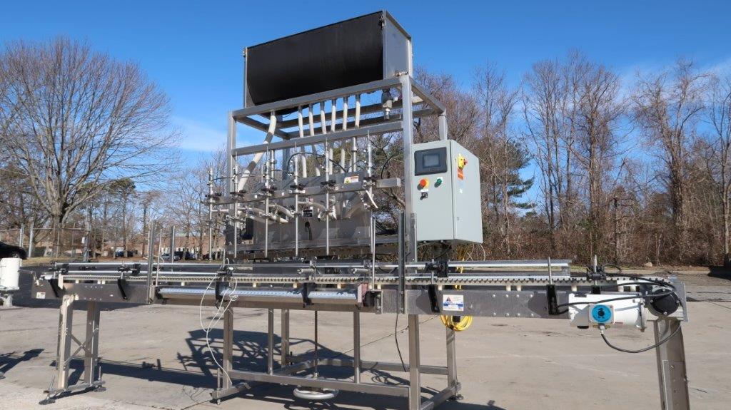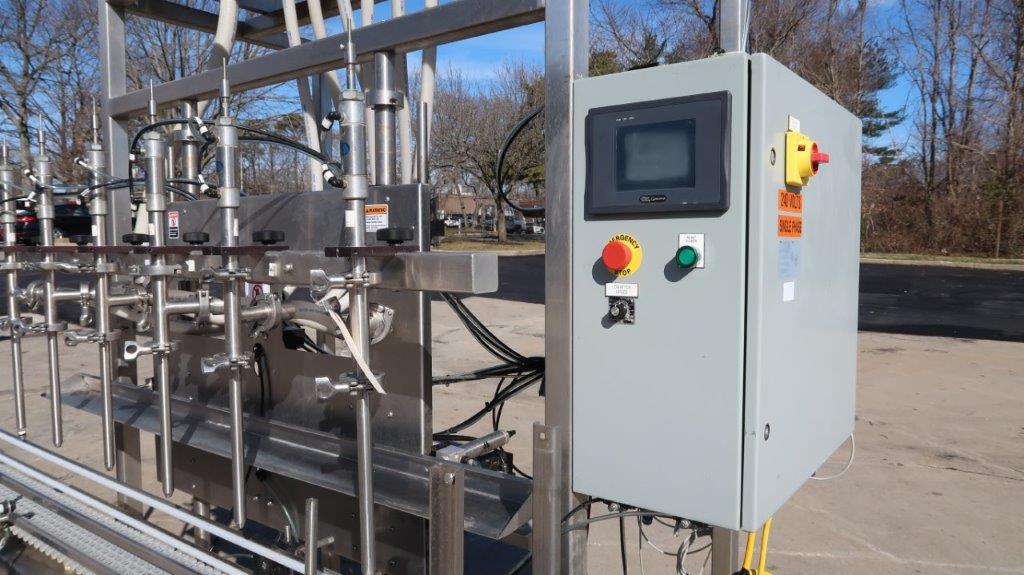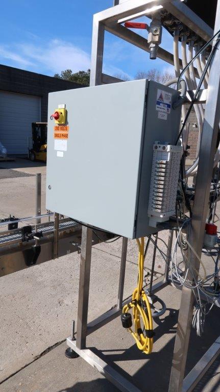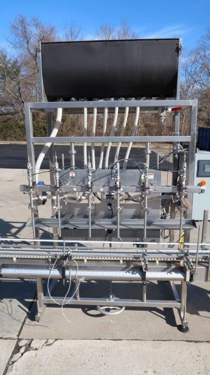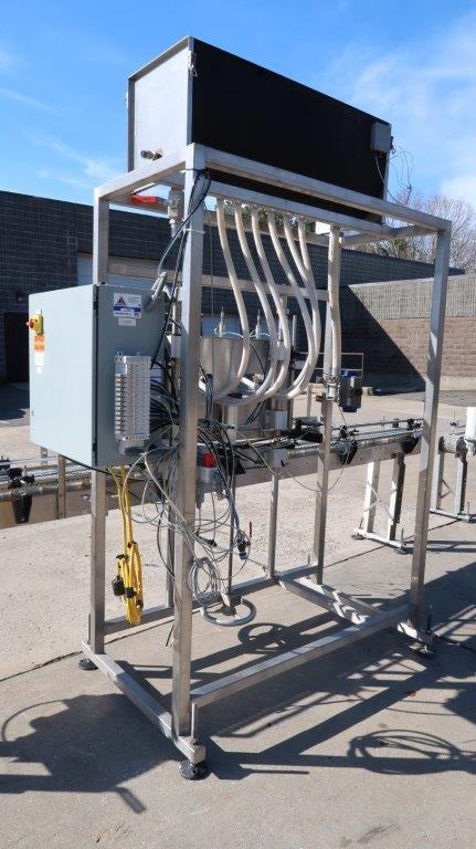 1-Used Apacks Six (6) Head Stainless Steel Automatic Sanitary Pressure Gravity Filling Machine, S/N 13119. Filler can easily be expanded to an eight (8) nozzle by adding two additional nozzles. Equipped with high temperature FDA silicone braided tubing, machine has air indexing cylinders and equipped with top-mounted 17 In. Wide X 46 In. Long X 18 In. Deep Stainless Steel insulated product feed tank. Equipped with side mounted control panel with Maple Systems “Weintek” Multi-Function Filler controller, including variable speed control. Equipped with all stainless steel framework, present nozzles measure approx. 3/4 In. diameter. With automatic drip tray, filler is supplied with approx. 177 In. long stainless steel motorized conveyor with 6 In. wide plastic conveyor chain. (Stock #8484B)
