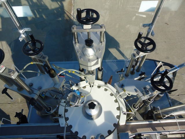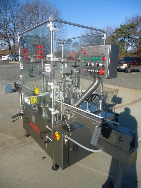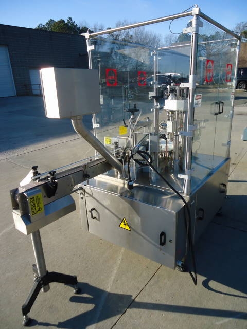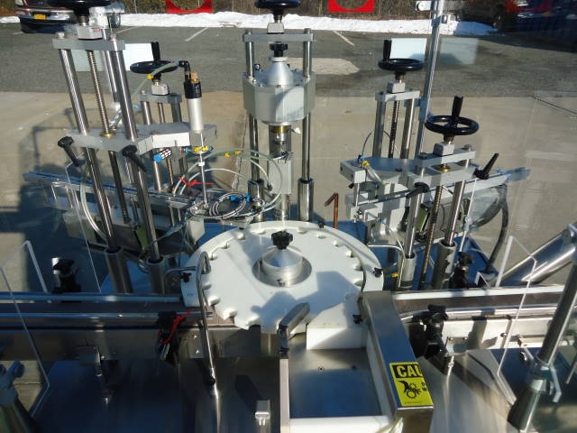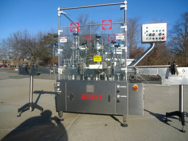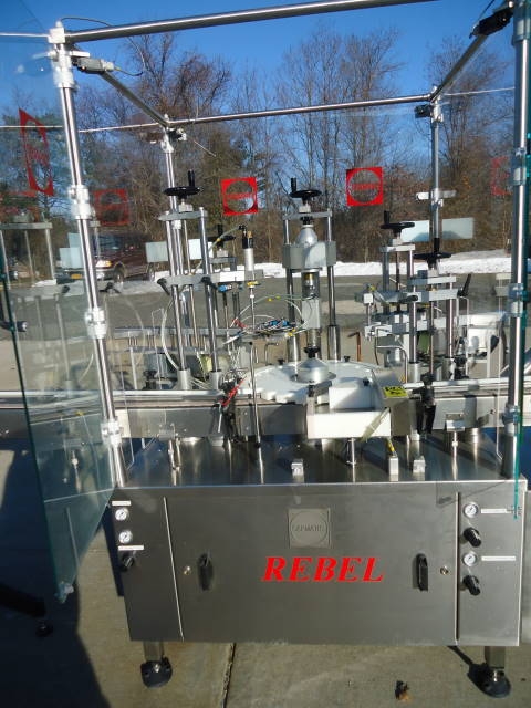1-Used Capmatic Rebel Monoblock Vial/Bottle Packaging Machine Model PCC11, S/N RE02100995. Rated up to 120 units per minute, this stainless steel unit was previously placing dip tube/crimping/ and over-capping approx. 1 in. diameter bottles. With Approx. 10 Ft. Long conveyor with plastic tabletop chain. Electrical specifications 3 phase, 60 cycle, 220 Volt. Supplied with operating manual. Further specifications available upon request. (Stock #7747A)