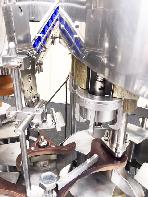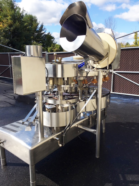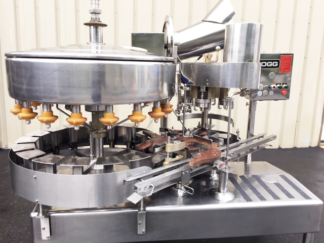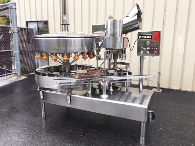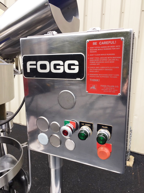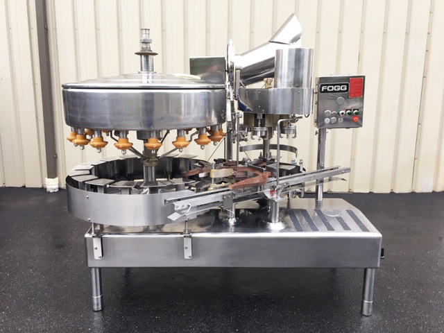 1-Used Fogg Model KG184-RH 18 Valve Rotary Bottle Filler, S/N 701785. Equipped with 4-head rotary screw capper set for 38mm diameter plastic screw caps, filler has 1 In. diameter filling nozzles and centers of 7.25 In. valve to valve distance. Equipped with Model D-LH rotary cap sorter and chute assembly (cap sorter S/N 777885). Presently equipped with bottle handling parts for 1 gallon containers. Electrical specifications 3/60/220 Volt. With stainless steel operator’s panel with emergency stop, machine has variable speed control. (Stock #L1345)