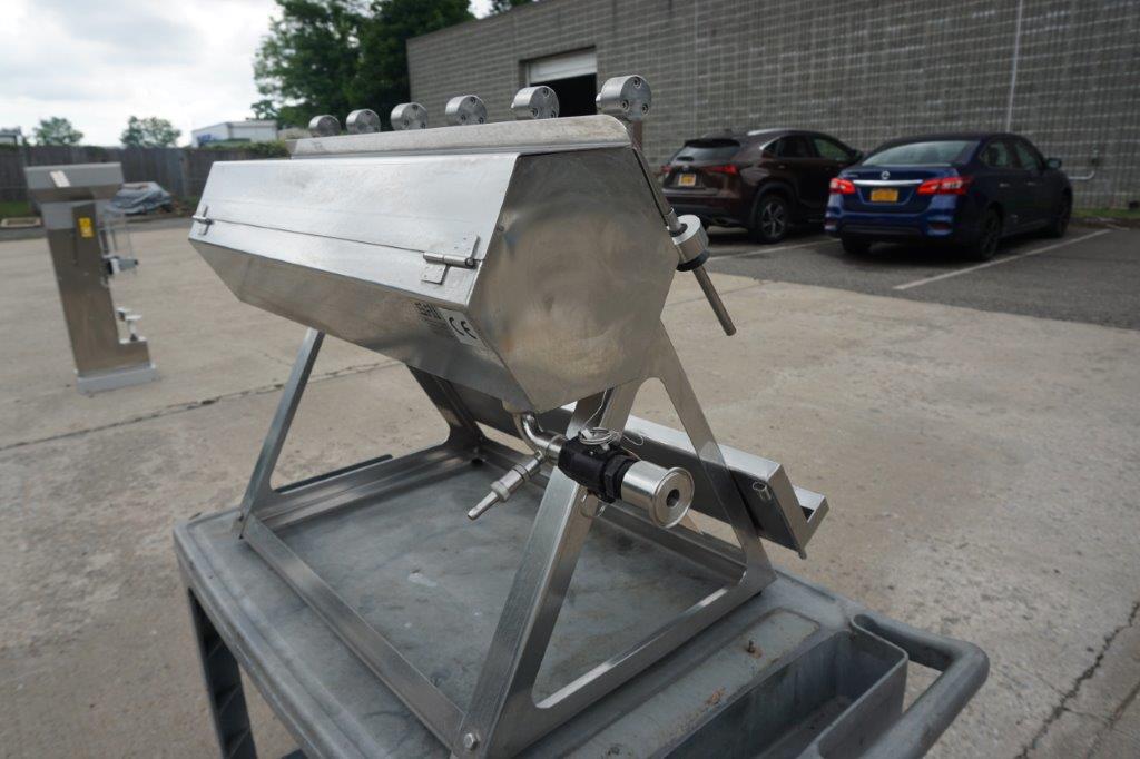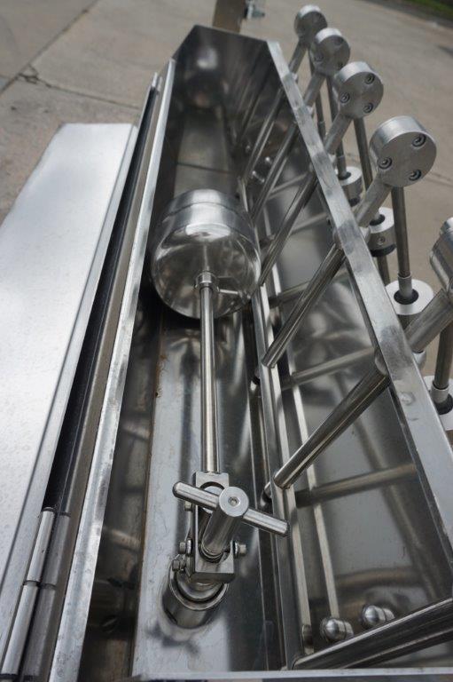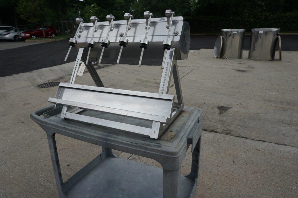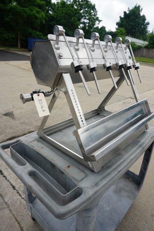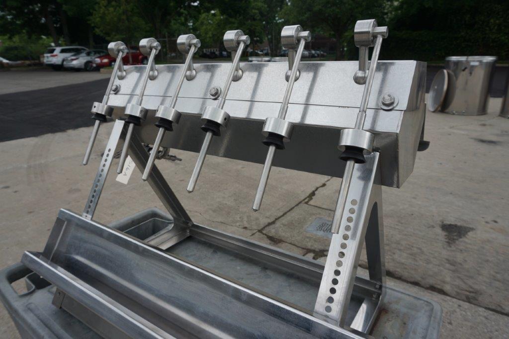 1-Used GAI Six Spout Semi-Automatic Straight Line Siphon Filling Machine. Last used for filling wine bottles, this entry-level filler is perfect for small wine bottle filling. Table shown in photos not included. (Stock #8516A)