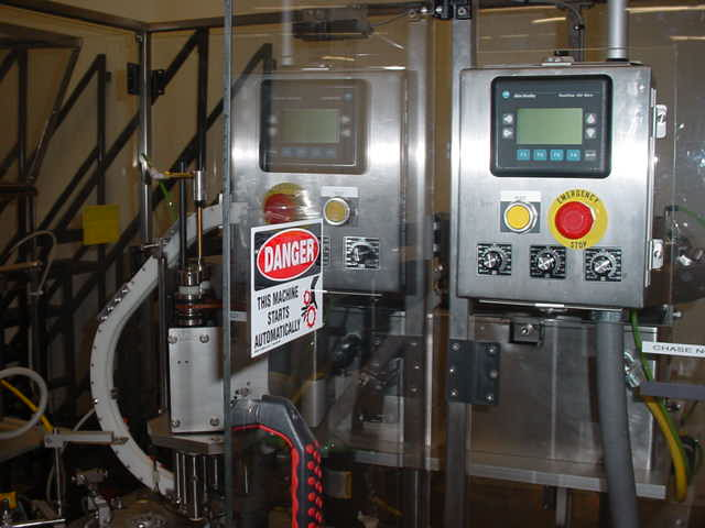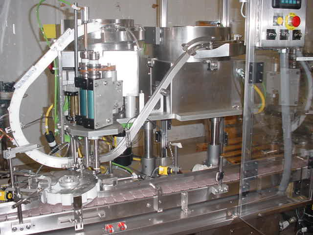 1-Used hull/chase logeman model fpc-12 monoblock filling/plugging/capping machine s/n 3921180. Rated up to approximately 50 containers per minute. Machine has plastic guard enclosures and a “no stopperer” sensor so that cap will not be applied if stopperer is not present. With allen bradley panelview 300 micro processor. Machine is on casters and is equipped with 3 1/2″ wide by 96″ long plastic table top conveyor chain. Machine can be supplied with accessory labeling head for labeling vials.