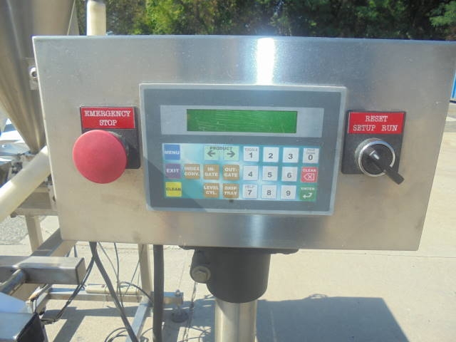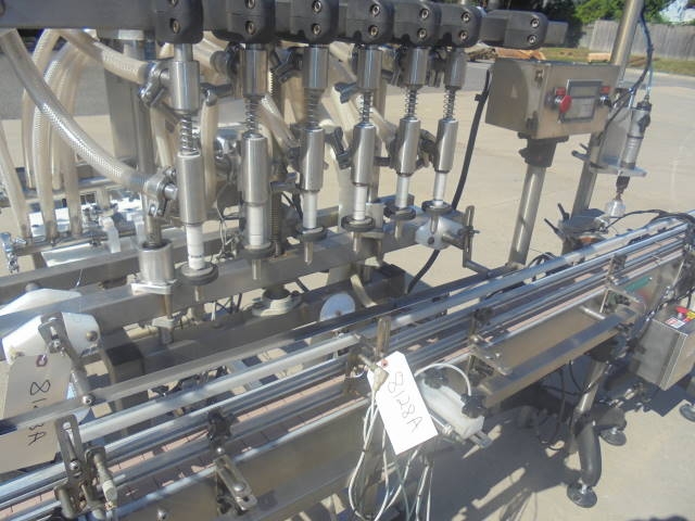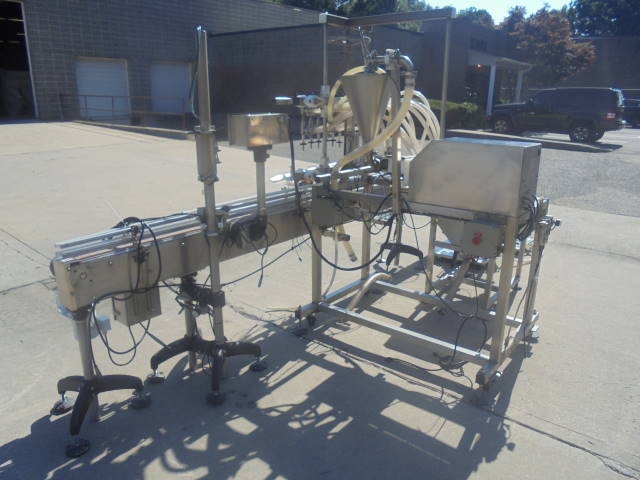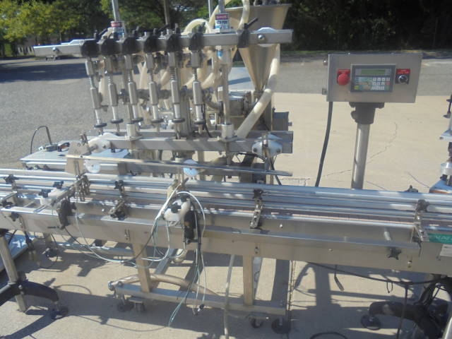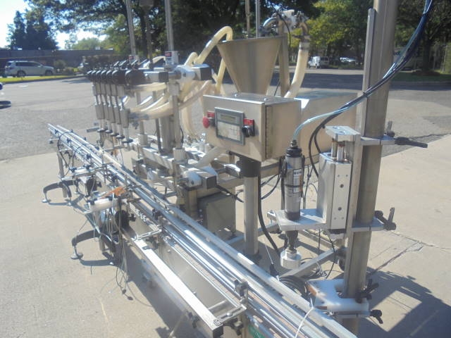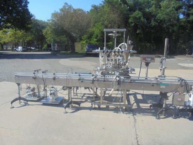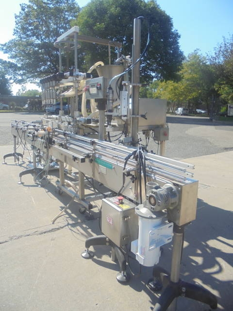 1-Used Inline Filling Systems “Servo” Fully Automatic Six (6) Head Stainless Steel Positive Displacement Filling Line. Line consists of Model FOFNT36 six head overflow filler (Serial #8115) with drip tray, and PLC Controlled, DC servo driven pump, with conical hopper. Suitable for delivering wide range of fills, line has approx. 15 ft. long stainless steel indexing conveyor (Serial # 8827), and 17 in. X 32 in. stainless overflow tank with lid and level control. Can be supplied with semi-automatic chuck cap tightener, and two Wilden air operated diaphragm pumps. This versatile filler is a popular choice in handling foamy products at higher speeds, and is also suitable for certain sauces, syrups, light gels and shampoos, foamy cleansers and also water-like products. (Stock # 8128A)