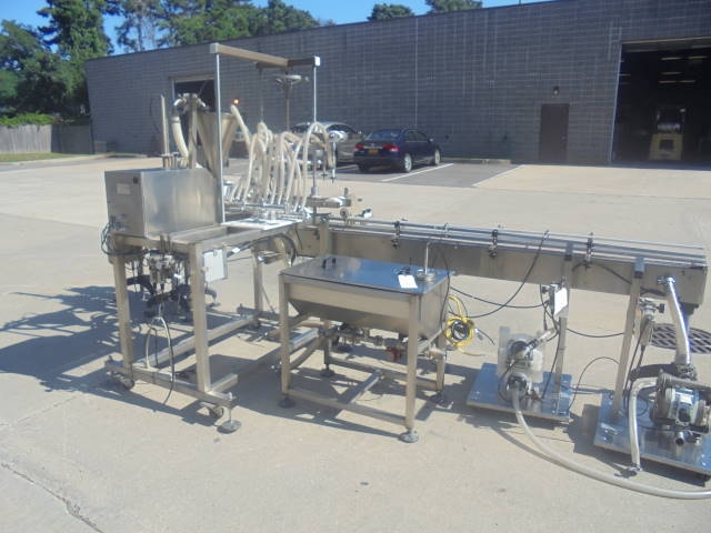 Inline Filling Systems “Servo” Six Nozzle Auto Positive Displacement Pump Style Filling Line, 15 ft. conveyor