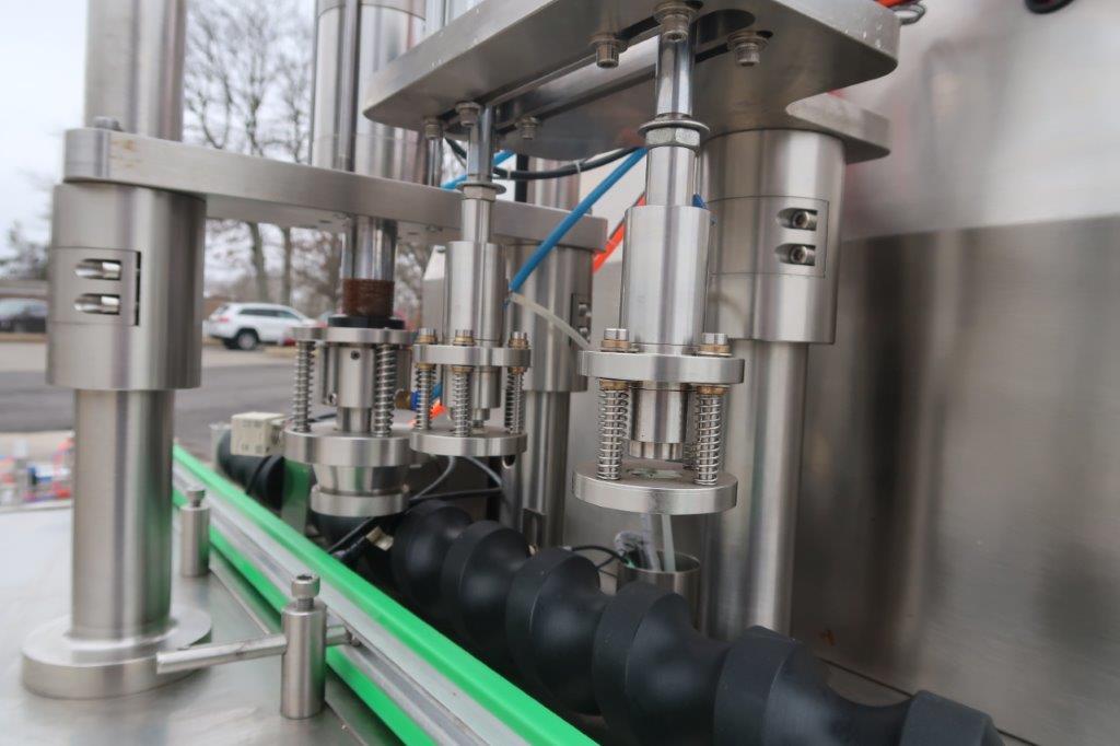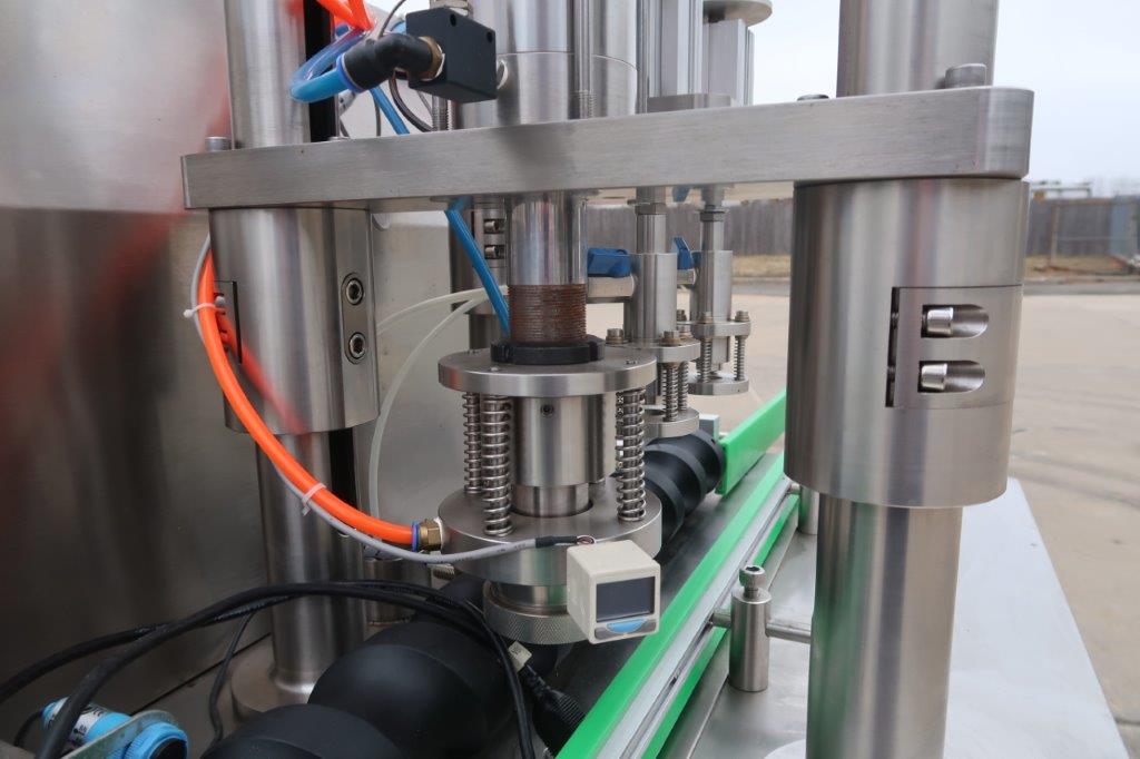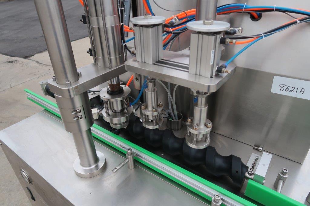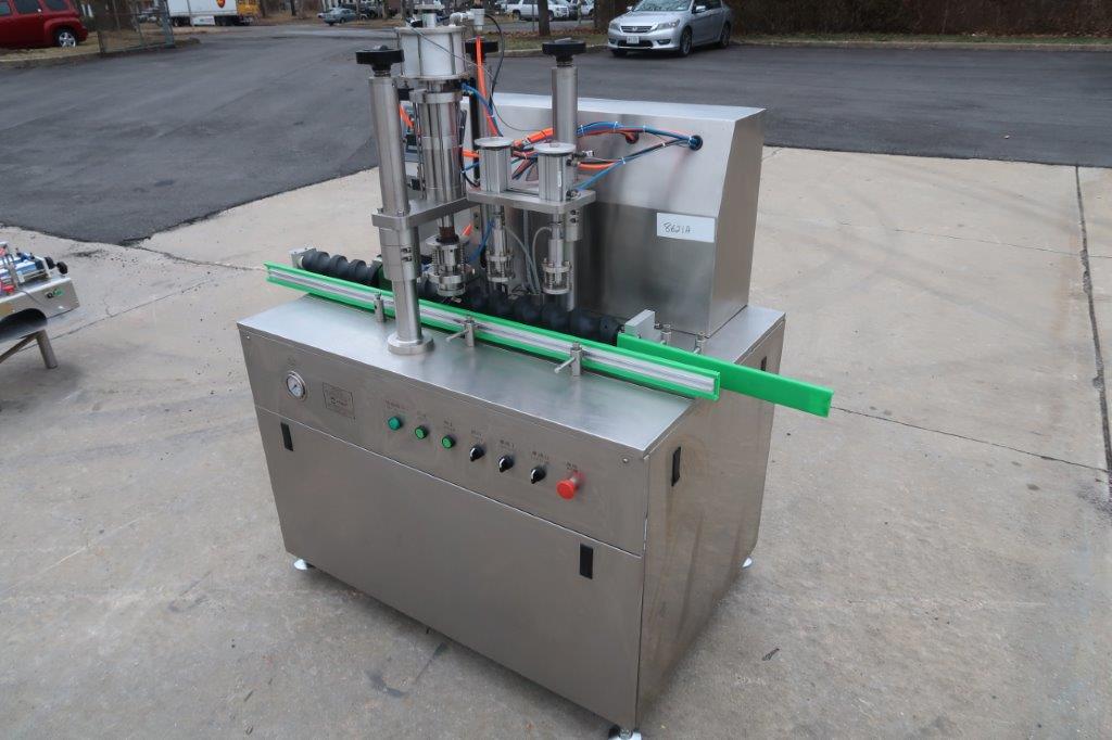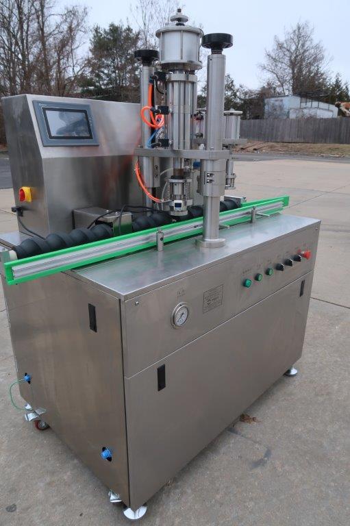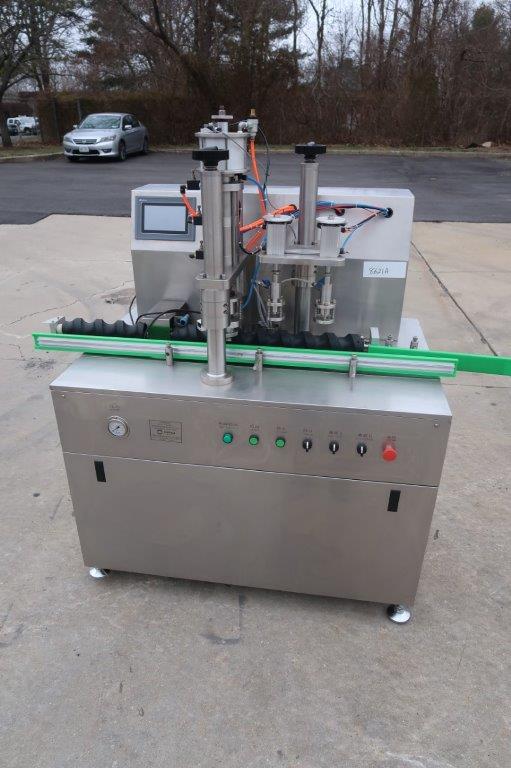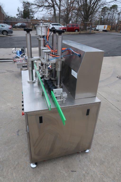 1-Used JRSEA Two Head Aerosol Filling Machine. Equipped with Crimping Station, filler has stainless steel cabinetry and worm infeed. (Stock #8621A)
