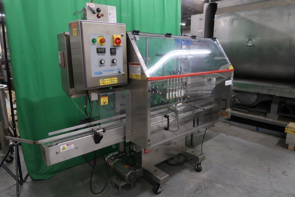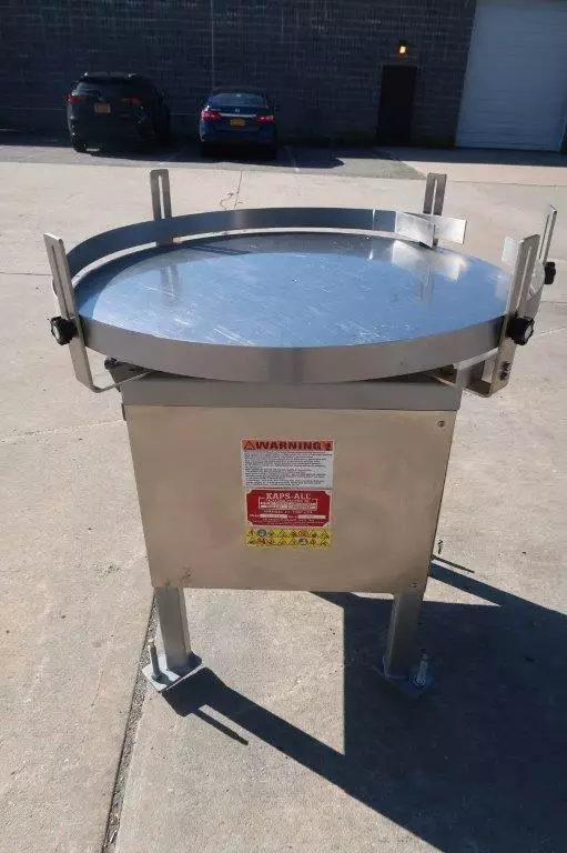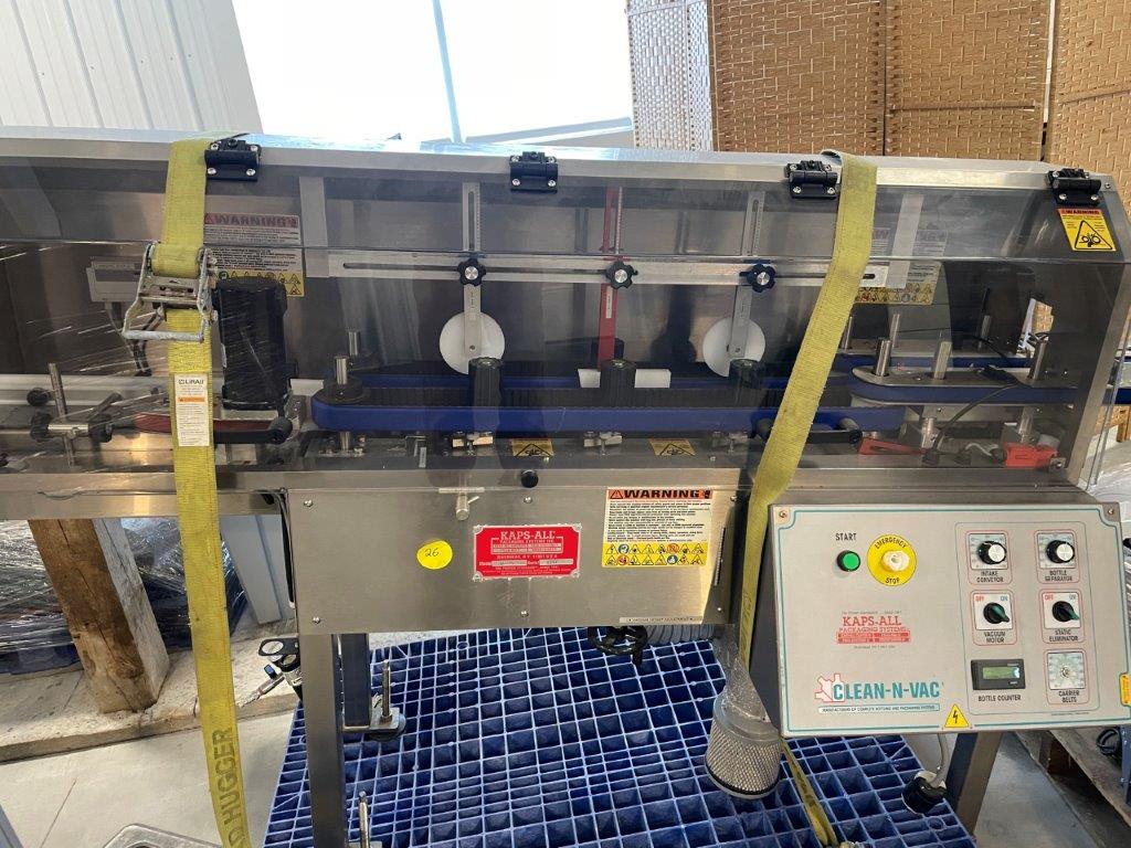 1-Used Kaps-All Automatic Liquid Filling Line. Line consists of Kaps-All 36 In. rotary unscrambling table with unscrambling shelf, Kaps-All “Clean-N-Vac” Bottle Cleaner, Kaps-All/Fills-All six head pressure gravity liquid filling machine with conveyor and diving nozzles, Kaps-All six spindle automatic screw capping machine, Automate Technologies (Kaps-All) AM-250 cap induction sealer and Kaps-All 36 In. diameter accumulating table. Conveyors available at additional cost. (Stock #L1444)
