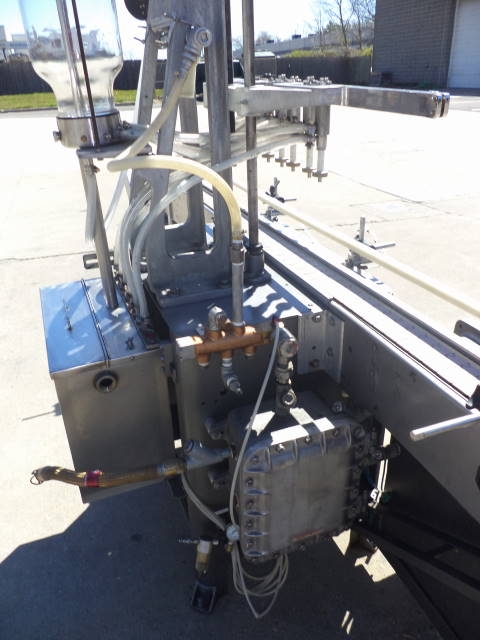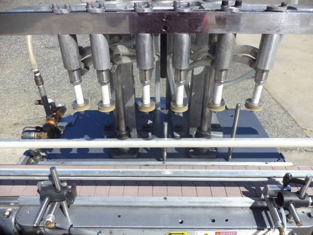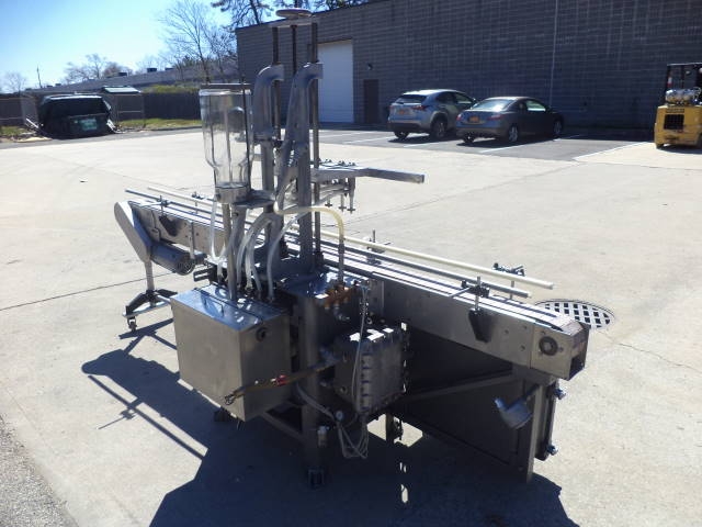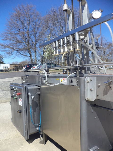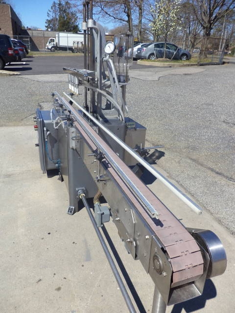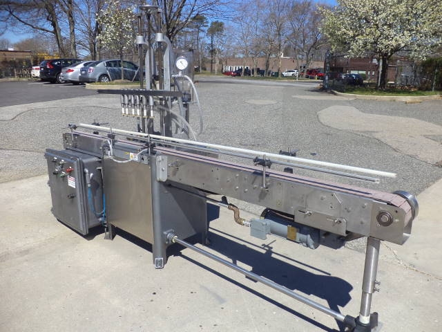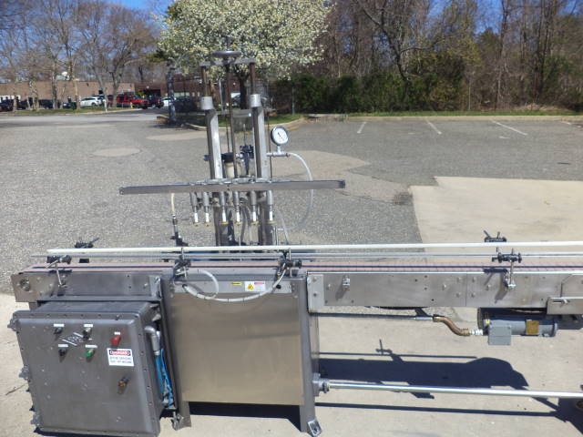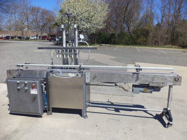 1-Used Fully Automatic Straight Line Liquid Filling Machine. This Explosion Proof Filler presently has six nozzles, but is expandable to 12 nozzles at additional cost. Equipped with approx. 11 ft. long Stainless Steel Conveyor with air indexing and approx. 4-1/2 in. wide plastic tabletop chain. Conveyor driven by 1 HP 3/60/208-230-460 volt explosion proof motor. Machine has automatic raising and lowering of spout bar for “bottom up” filling feature. On casters for portability, Filler currently set up for vacuum operation, but can be converted to gravity pressure. Gravity filling at additional cost. Equipped with approx. 10 in. wide X 20 in. long X 16 in. deep Stainless Steel Overflow Tank with lid. (Stock #8570z)
