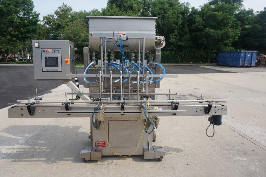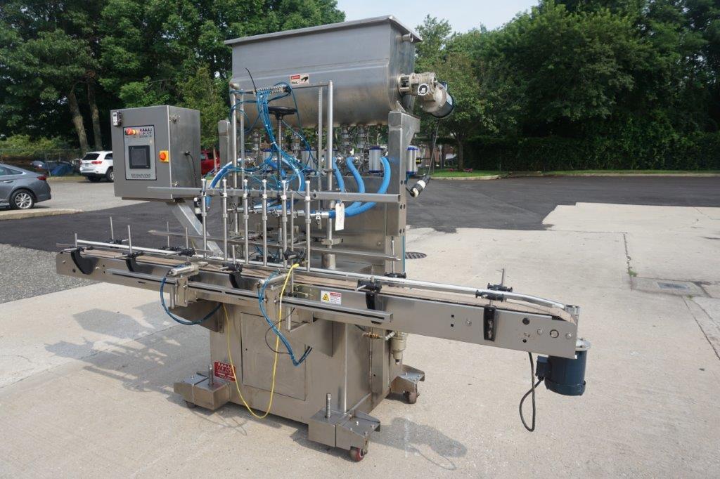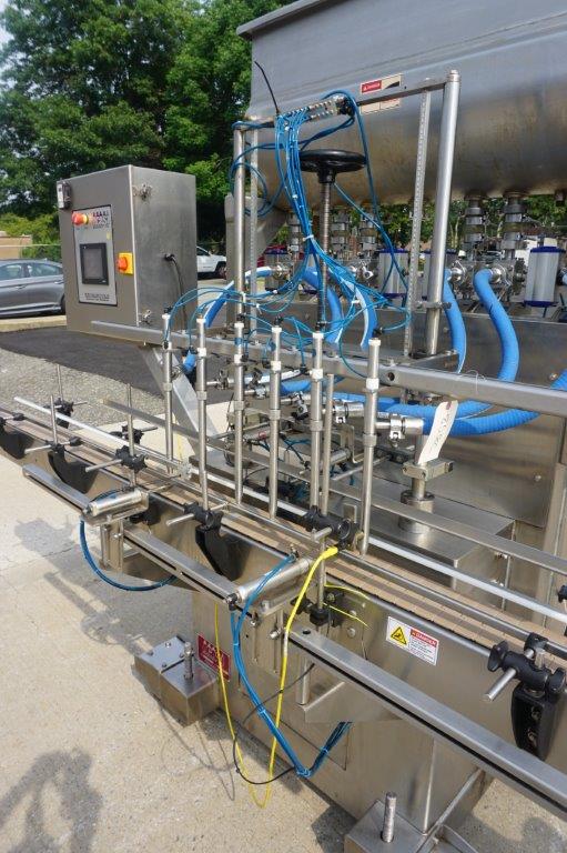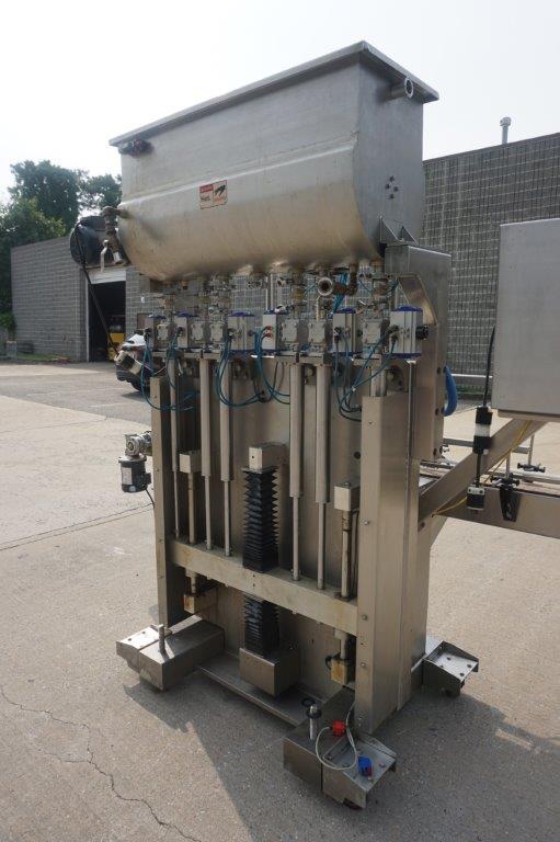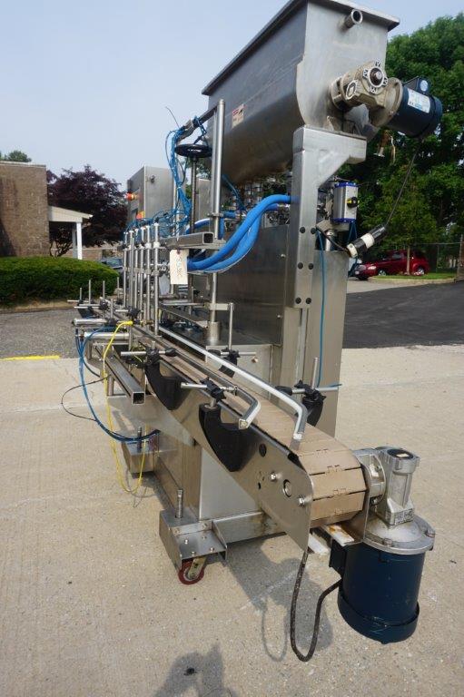 1-Used Acasi Six Head Fully Automatic Inline Piston Filling Machine, Model T-Piston, Serial Number 2024. Equipped with six (6) vertical pistons, each measuring approximately 2 In. diameter X 17 In. High, filler has 118 In. Long motorized conveyor with air indexing cylinders and 4.5 In. Wide plastic tabletop conveyor chain. With top mounted 14 In. Wide X 42 In. Long stainless steel jacketed hopper with lid and internal paddle agitation and drive. Equipped with insulated hoses for “hot filling”, machine last used for filling food products. With “bottom-up” filling, filler has drip tray and is on casters for portability. With front mounted control panel, filler has single phase electrics. (Stock #8538C)