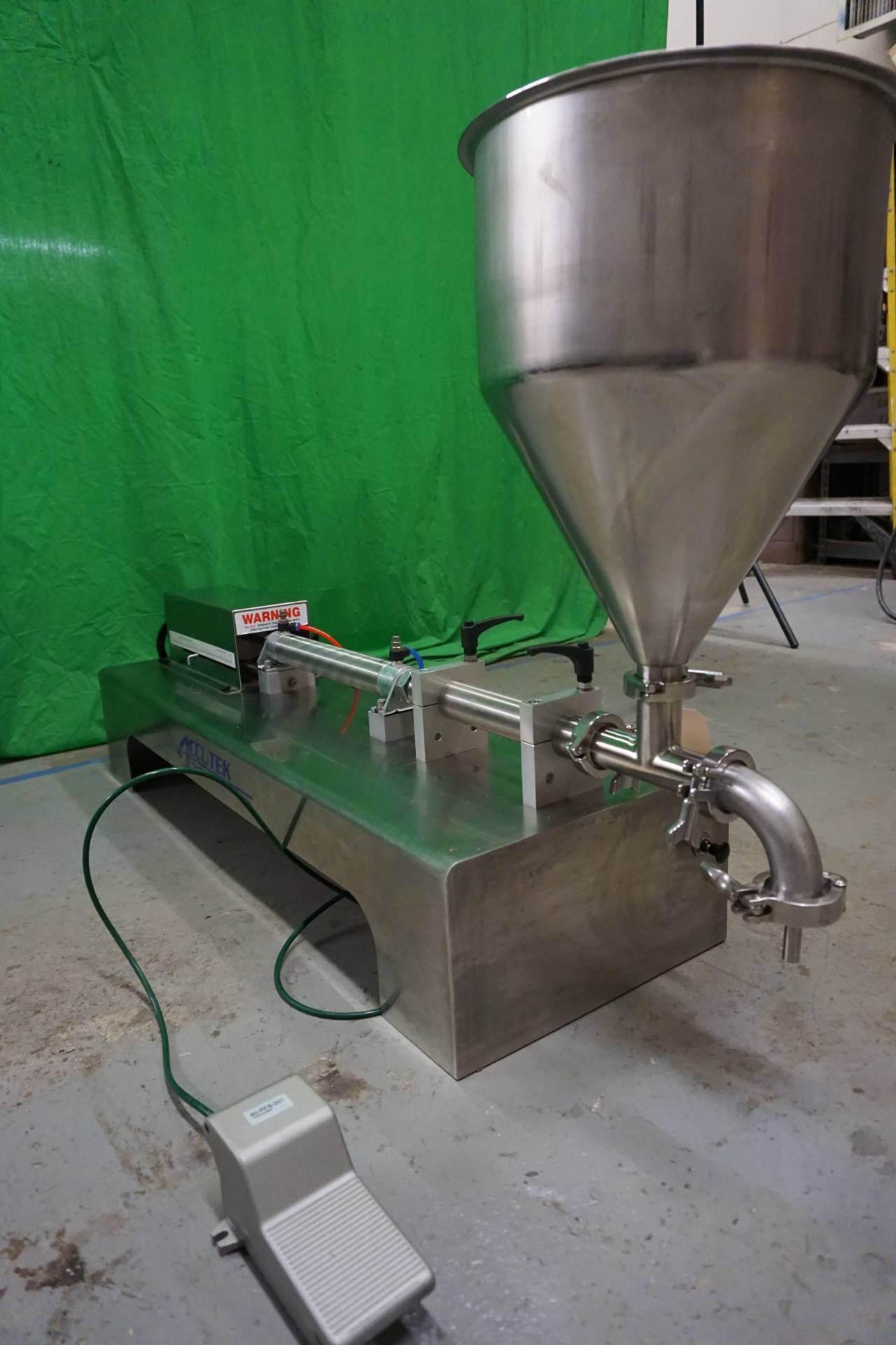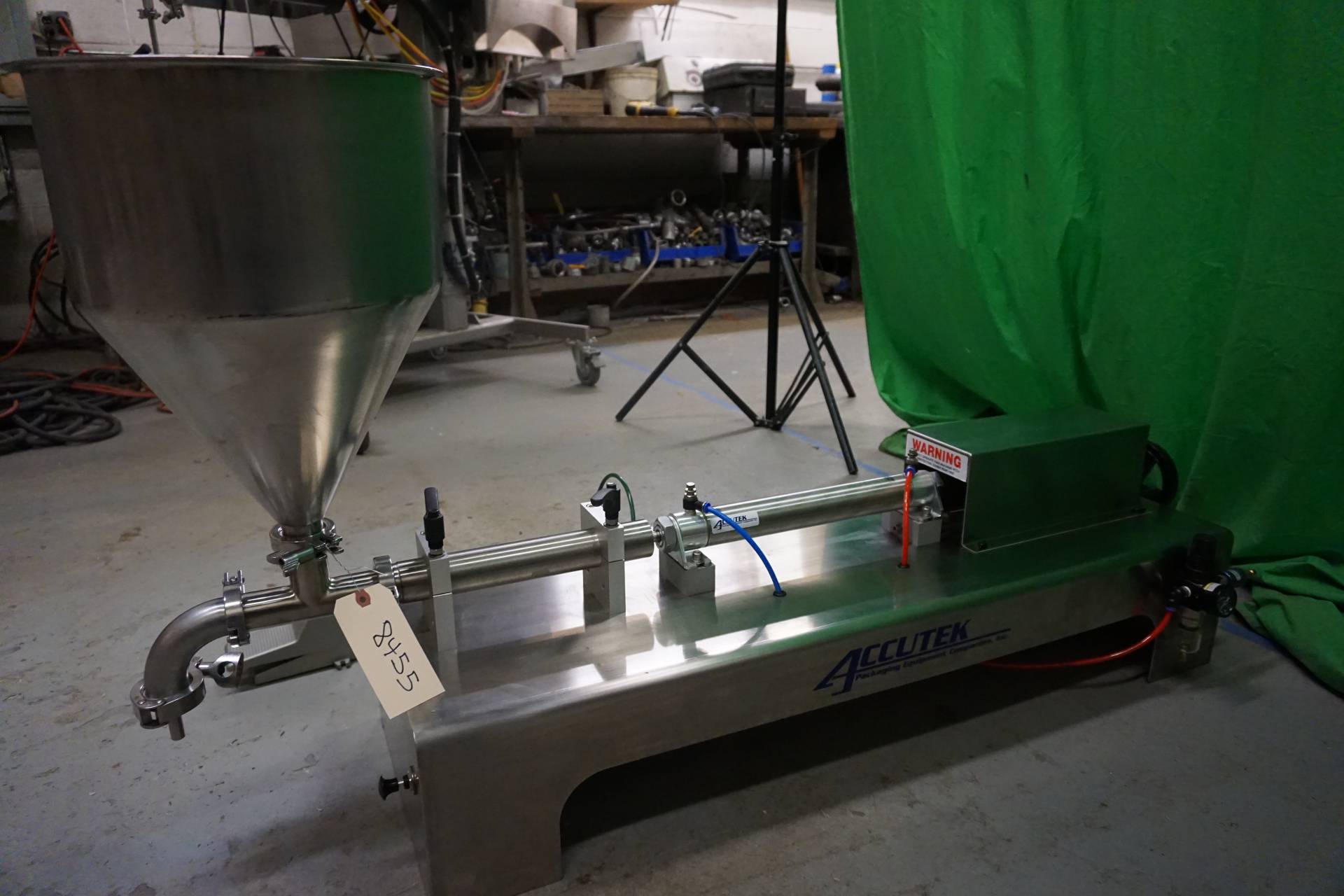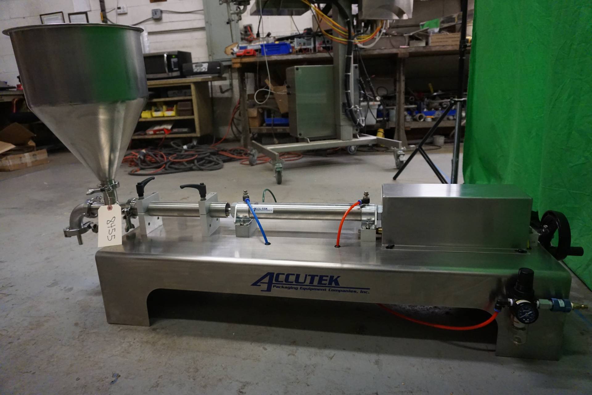1-Used Accutek SVF Series Single Head Semi-Automatic Air Operated Piston Filler, Serial Number A-17203662.  Rated up to 30 containers per minute depending on size of fill and viscosity of product, Filler currently has stainless steel piston measuring approx. 1-1/2 In. Diameter X 9 In. Long.  Equipped with top mounted stainless steel hopper, Filler comes with foot switch for semi-automatic operation. Table shown in photos available at an additional cost. (Stock #8455)