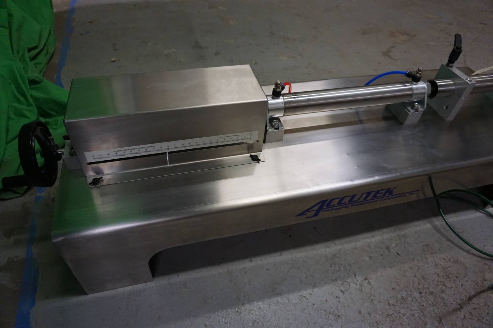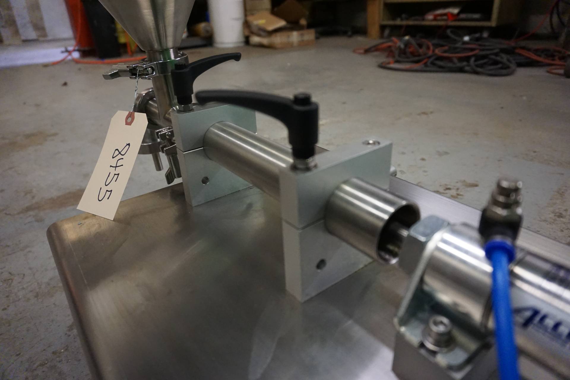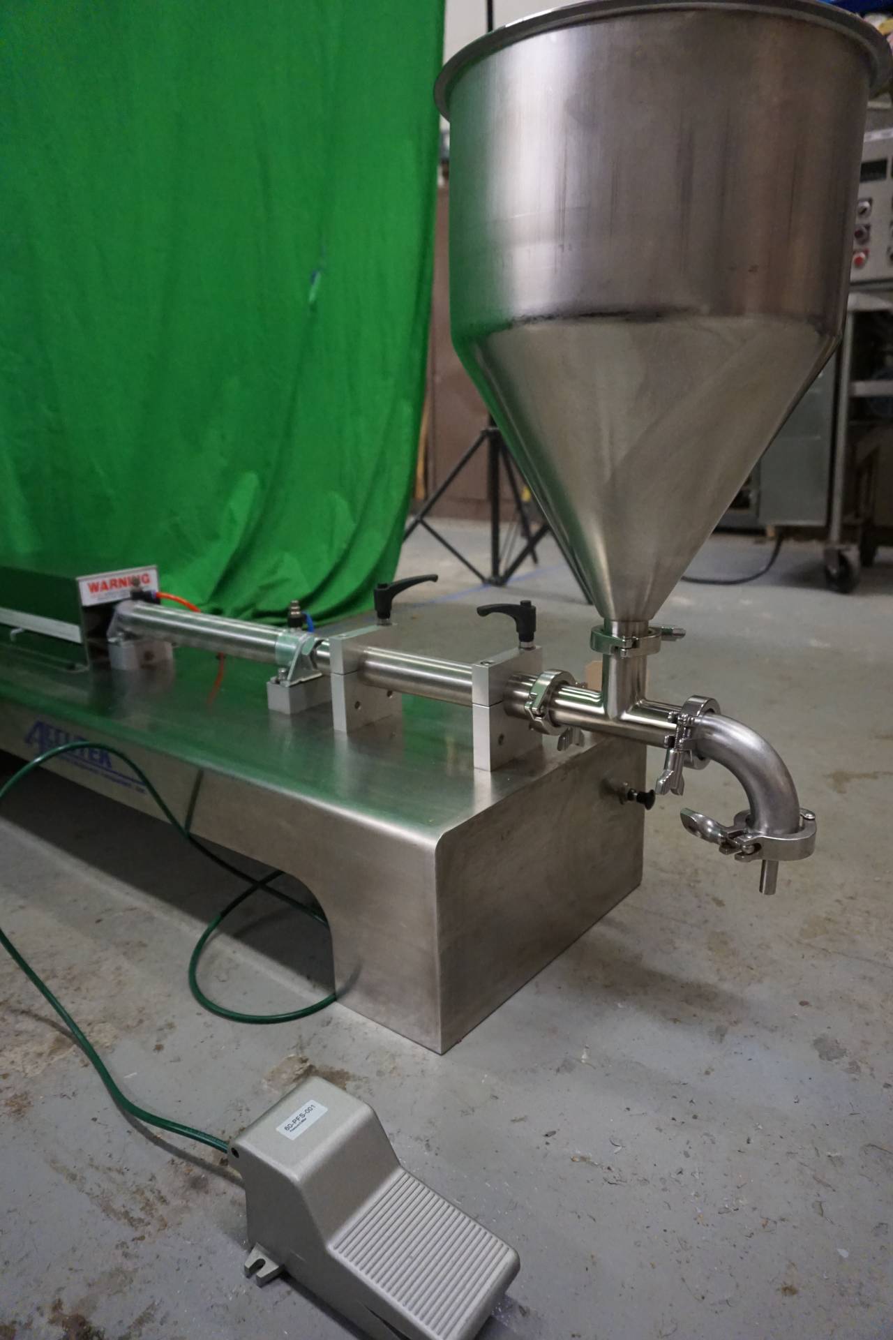 1-Used Accutek SVF Series Single Head Semi-Automatic Air Operated Piston Filler, Serial Number A-17203662.  Rated up to 30 containers per minute depending on size of fill and viscosity of product, Filler currently has stainless steel piston measuring approx. 1-1/2 In. Diameter X 9 In. Long.  Equipped with top mounted stainless steel hopper, Filler comes with foot switch for semi-automatic operation. Table shown in photos available at an additional cost. (Stock #8455)