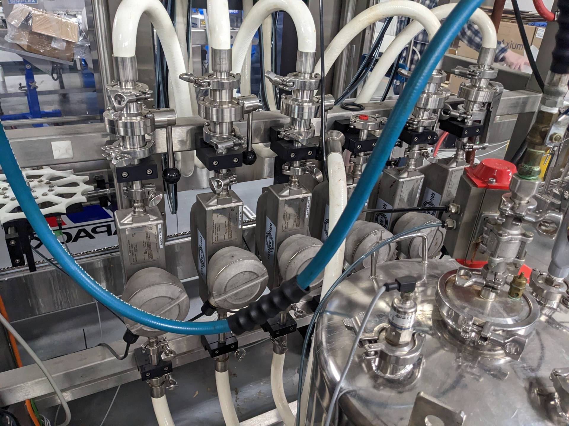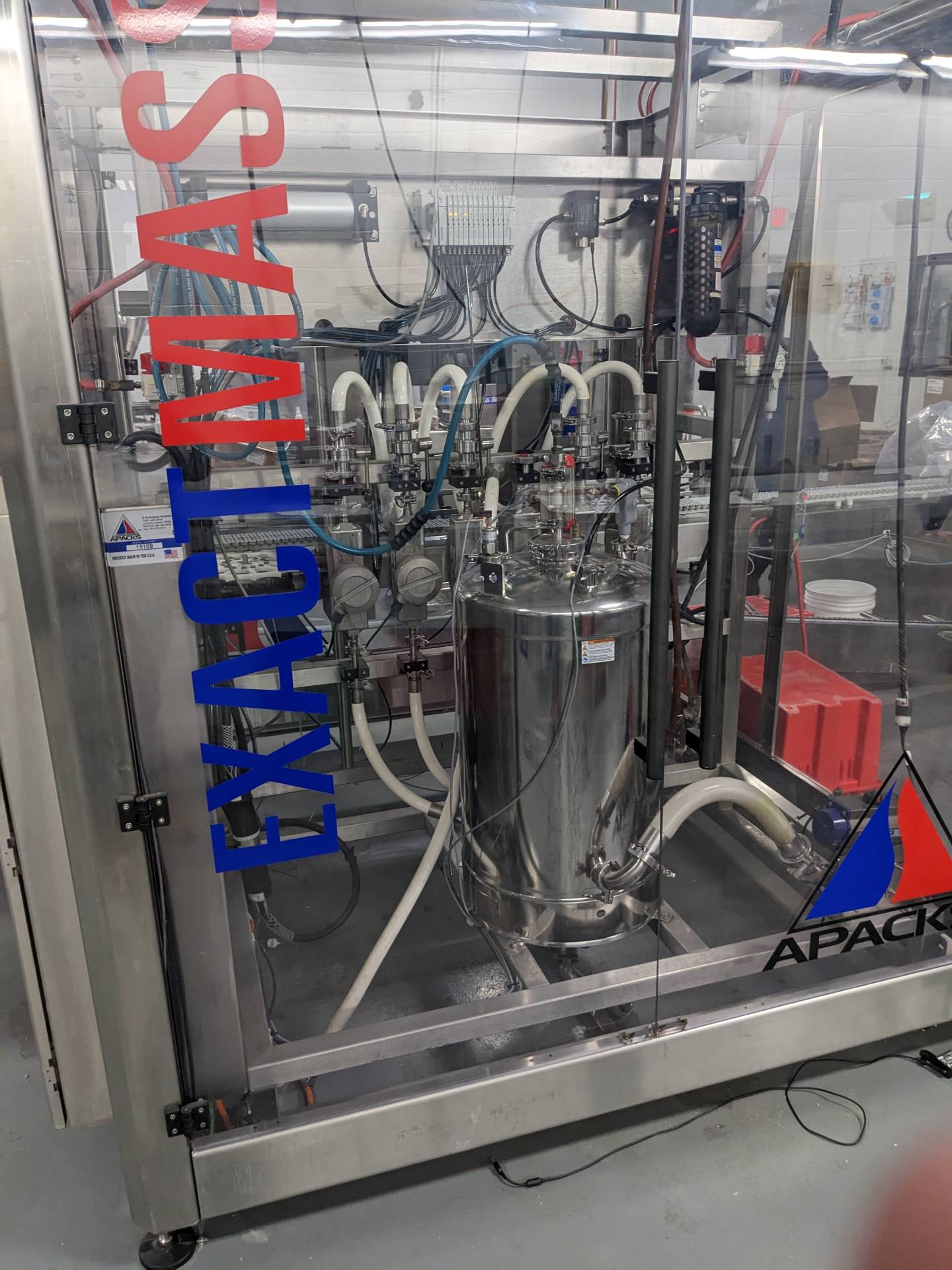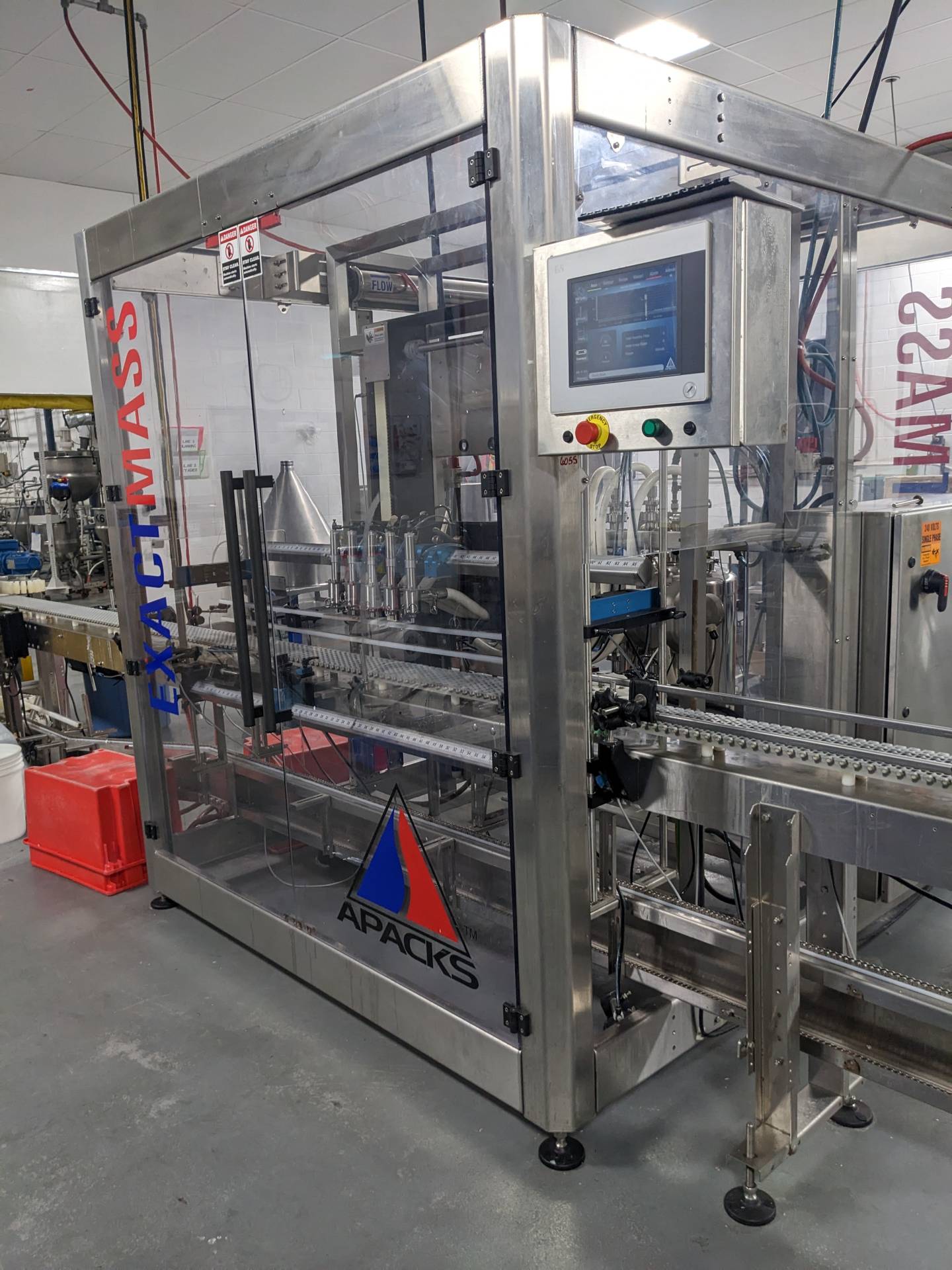 Apacks Six Head Automatic Mass Flow Meter Pressure Filling Machine, with conveyor