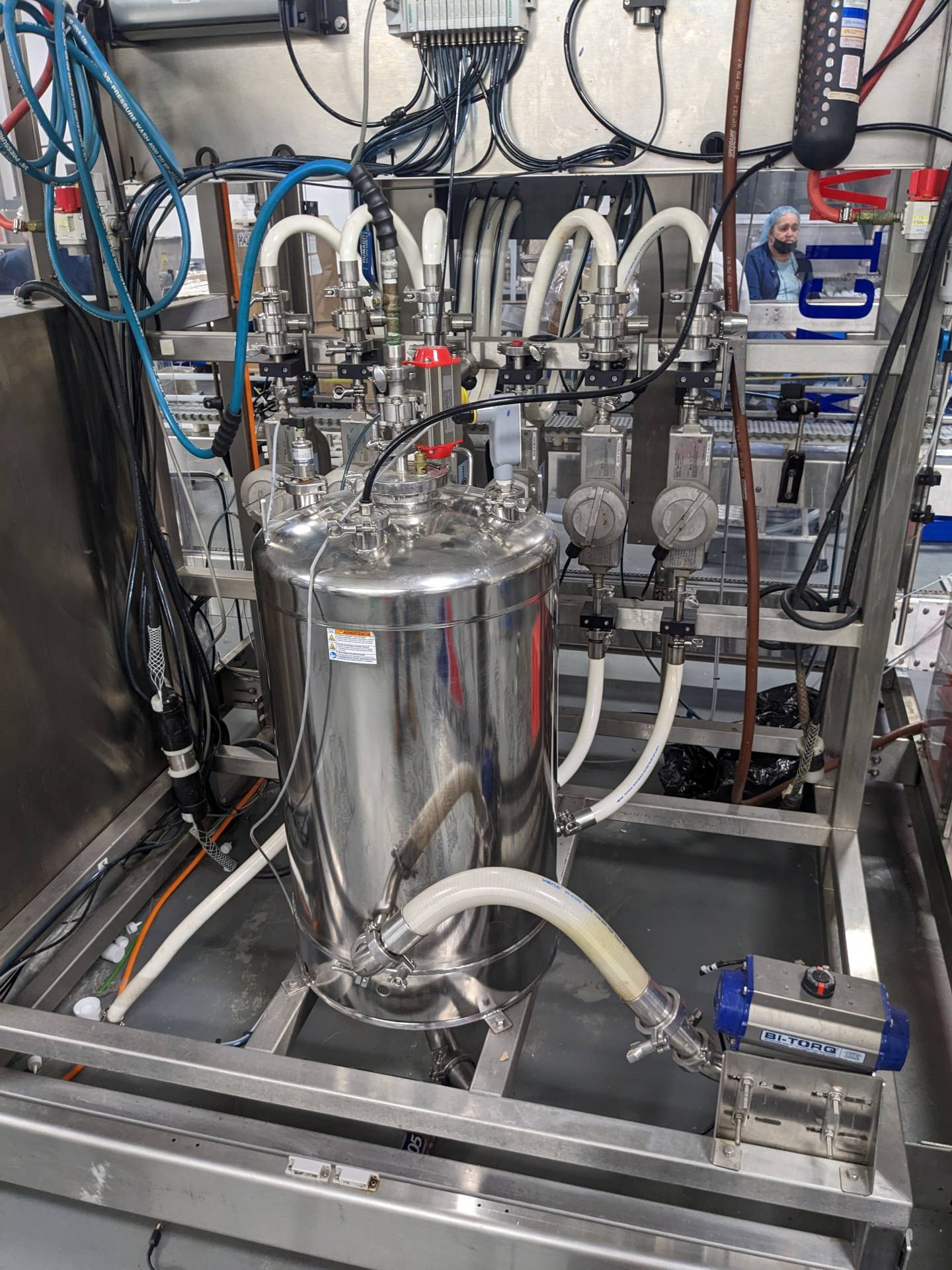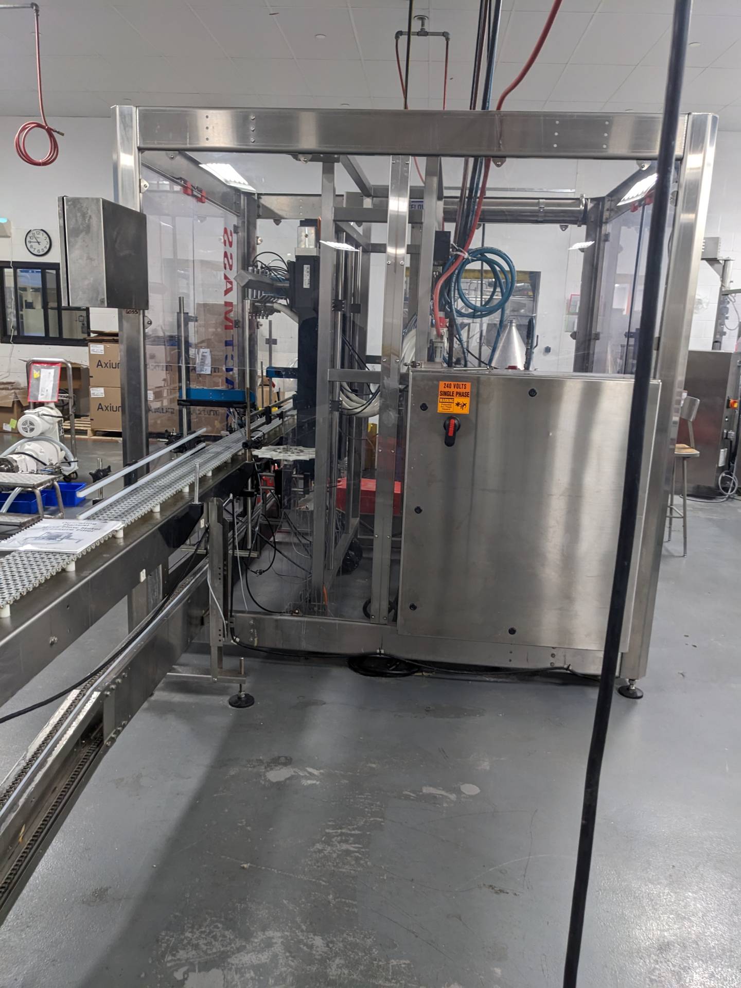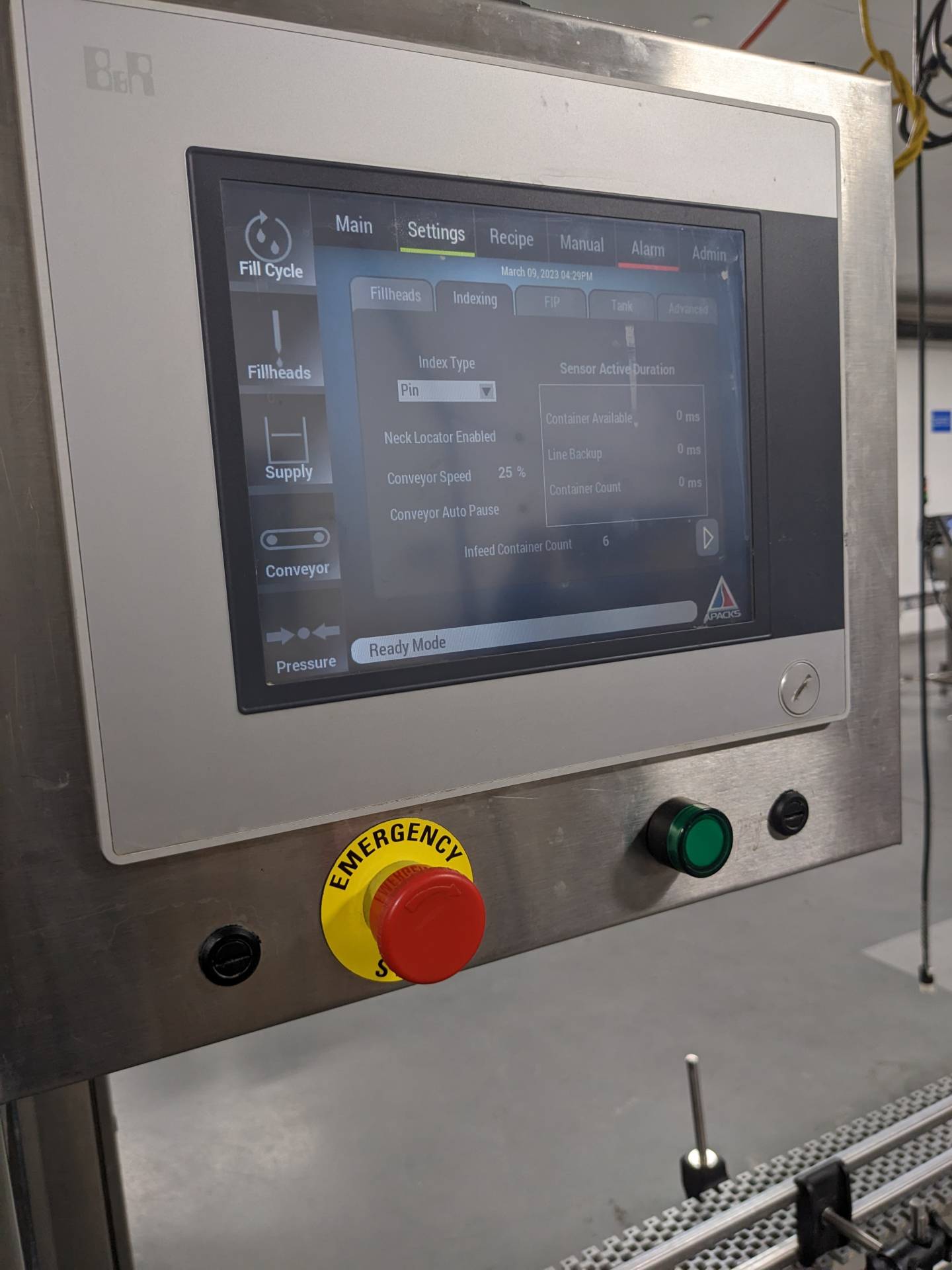 1-Used Apacks Six Head Stainless Steel Automatic Straightline Mass Flow Meter Pressure Filling Machine. This versatile fill is suitable for both liquids and more viscous products, and is equipped with approximately 25 Ft.long motorized indexing conveyor. Designed for filling both small containers as well as larger ones, filler has control screen for numerous features. With rear mounted stainless pressure tank, filler last used for filling personal care products. (Stock #L1441)