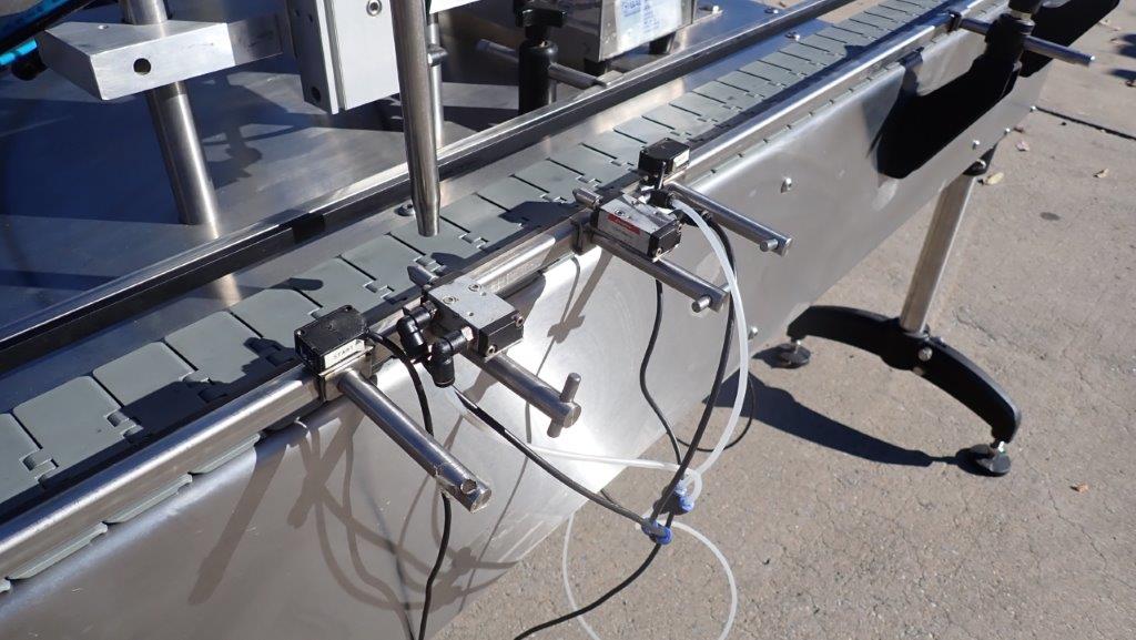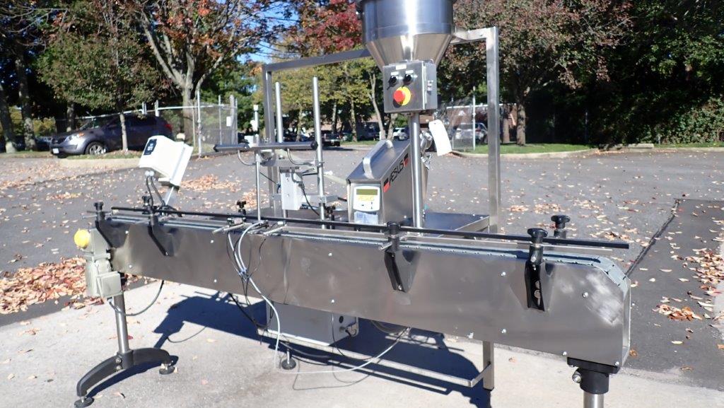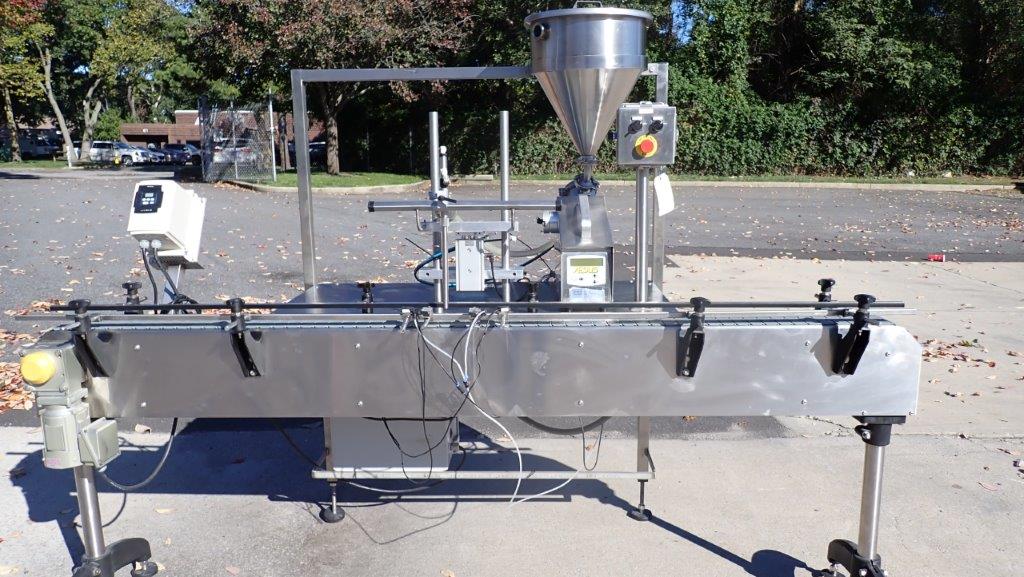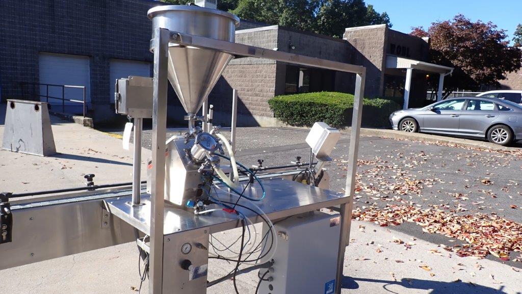 1-Used Balpack Automatic Stainless Steel Pump Style Positive Displacement Filling Machine, Serial Number 121089. With “diving” nozzle, this versatile filling machine is suitable for liquids up to creams/gels and is equipped with Aesus Model AF1 pump head, Serial Number 10-01-237. Filler can handle ounce through gallon size fills, and is equipped with 14 In. diameter stainless conical hopper with lid. With 8 foot long stainless steel motorized conveyor with variable frequency drive and 4 In. wide plastic tabletop chain. Last used in the pharmaceutical industry, machine has single-phase electrics and stainless steel starter box. (Stock #8792F)