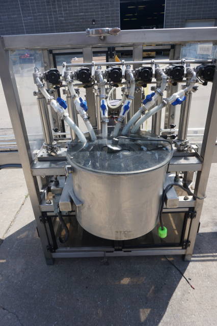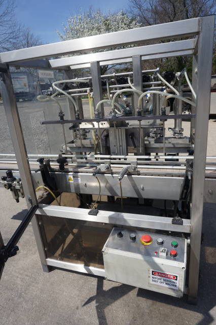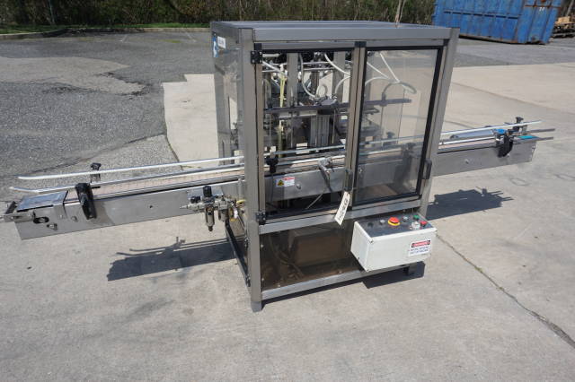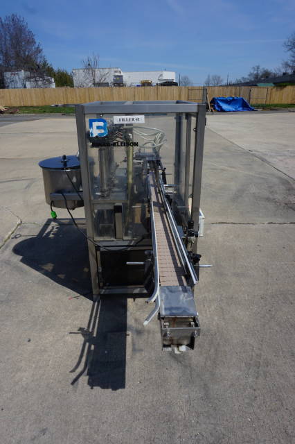 1-Use Biner Ellison Six Head fully Automatic Stainless Steel Straight Line Piston Filling Machine. Rated up to 120 containers per minute, machine has approximately 2 inch diameter by 11 inch long adjustable pistons and Servo actuated valves. Filler has enclosure around it, and is equipped with approx. 10 ft. long Stainless Steel Conveyor with pneumatic indexing and approximately 4-1/2 inch wide plastic tabletop chain. Filler has diving nozzles and Stainless Steel 16 inch diameter by 12 inch deep central Feed Tank. Electrical specification Single phase, 110 volt electrics (Stock # 8354)