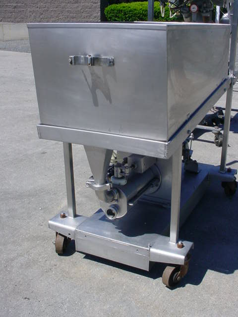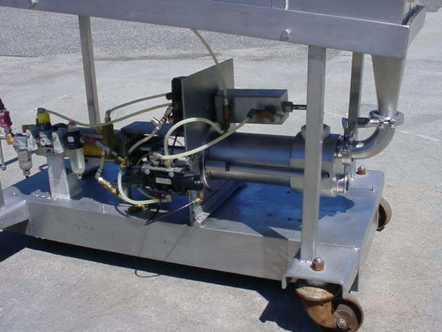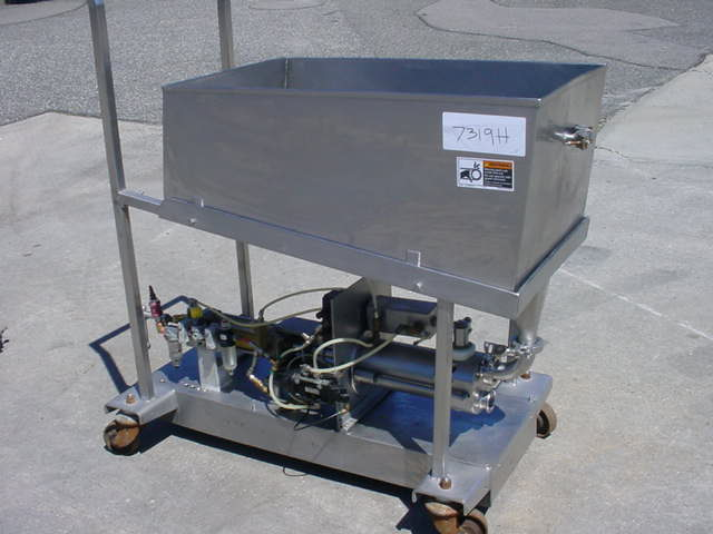 1-USED SINGLE PISTON AIR OPERATED DEPOSITOR/PUMP STATION. MOUNTED ON STAINLESS STEEL “LOW PROFILE” PORTABLE BASE. ON CASTERS, UNIT HAS APPROX. 4″ DIAMETER X 7″ LONG STAINLESS STEEL PISTON/CYLINDER COMBINATION. EQUIPPED WITH TOP MOUNTED APPROX. 18″ WIDE X 30″ LONG x 12″ DEEP PRODUCT HOPPER.