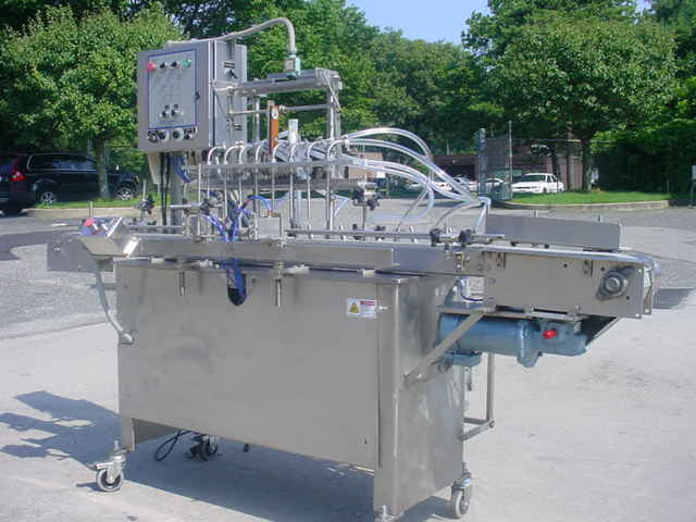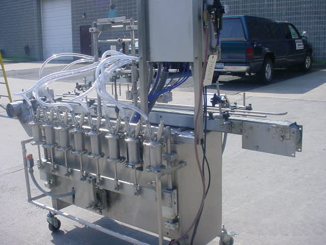 1-USED FILLING EQUIPMENT COMPANY EIGHT PISTON STAINLESS STEEL AUTOMATIC FILLING MACHINE. EQUIPPED WITH EIGHT (8) APPROX. 2-1/2" DIAMETER X 5" HIGH STAINLESS STEEL PISTONS, MACHINE HAS STAINLESS STEEL CABINETRY, "BOTTOM UP" FILLING OF CONTAINERS AND IS ON CASTERS FOR PORTABILITY. EQUIPPED WITH APPROX. 96" LONG INDEXING CONVEYOR WITH PLASTIC TABLETOP CHAIN. FILLER HAS TOP MOUNTED CONTROL PANEL WITH VARIABLE SPEED CONTROLS, COUNTER, ETC.