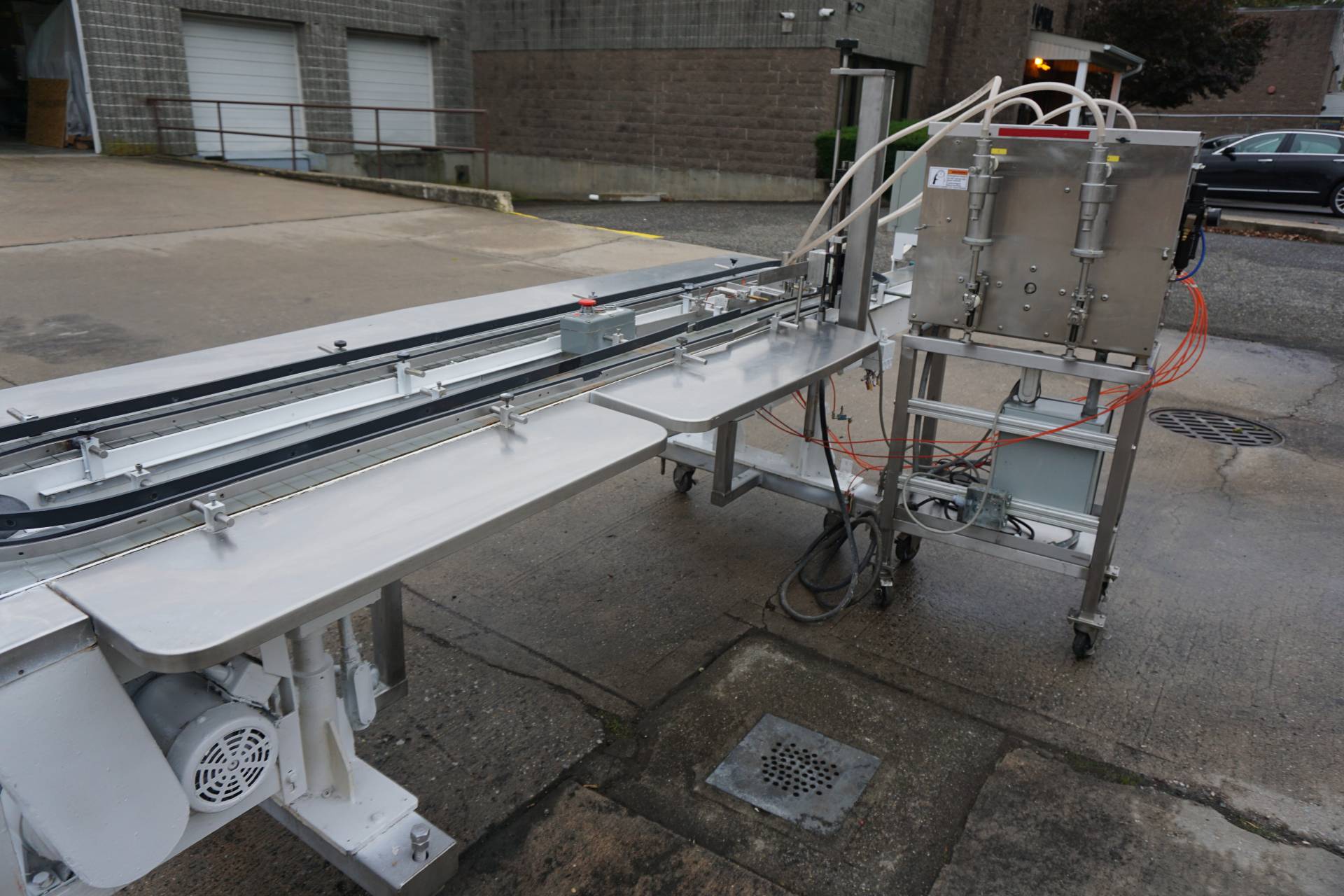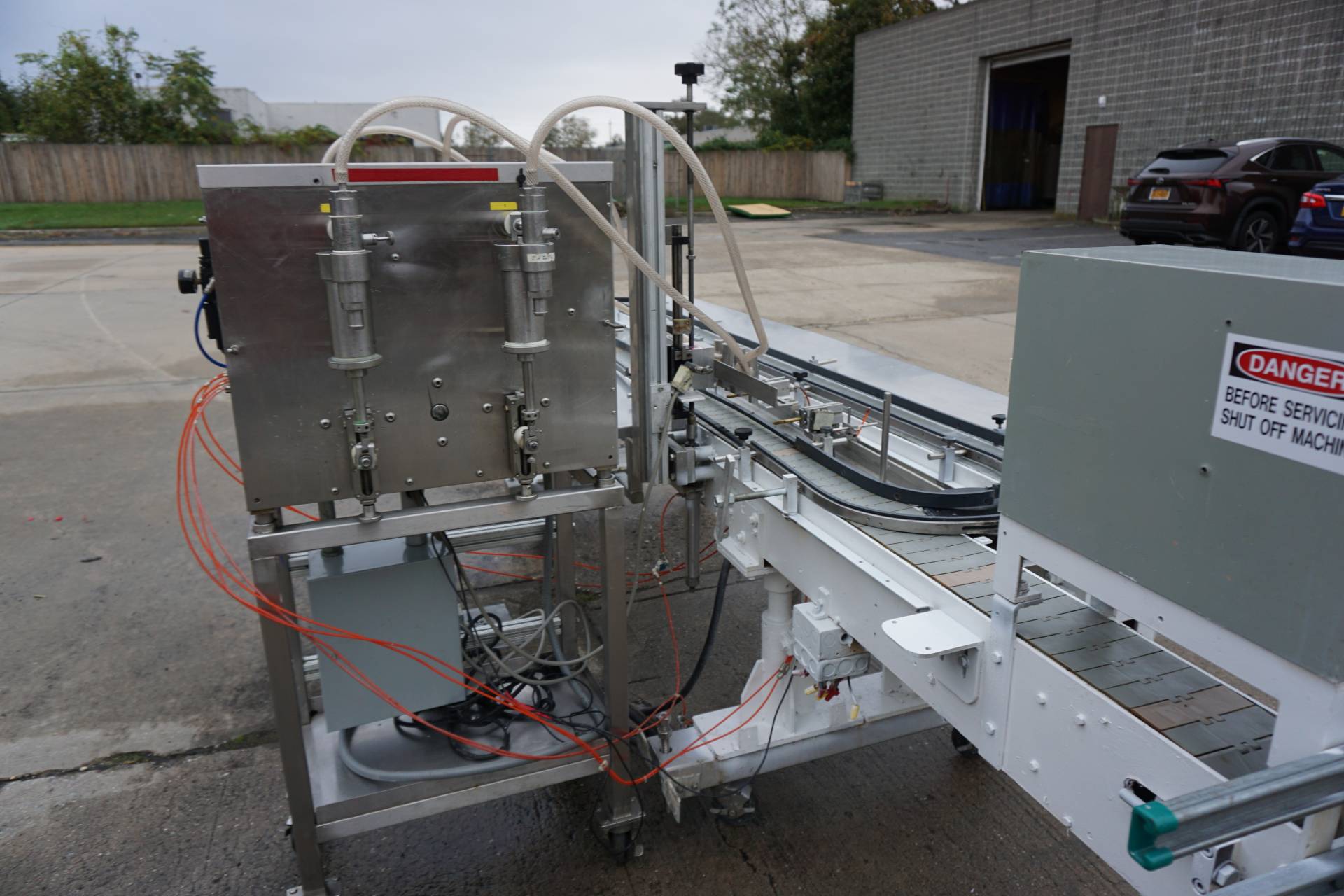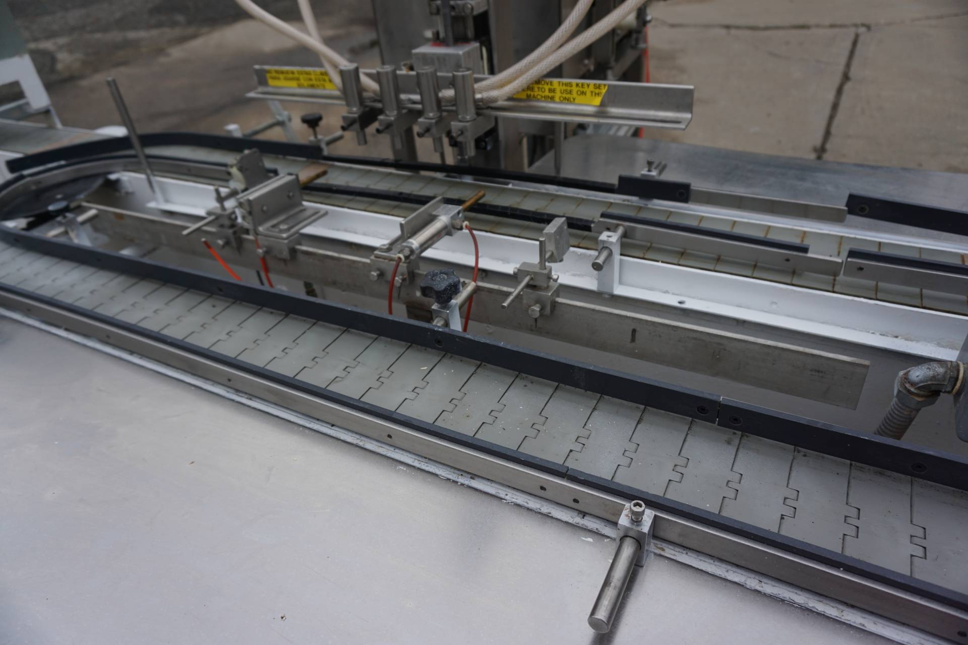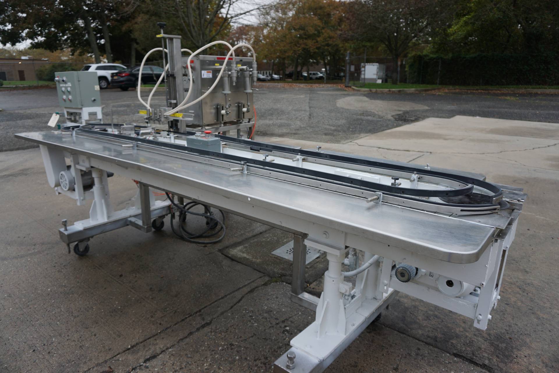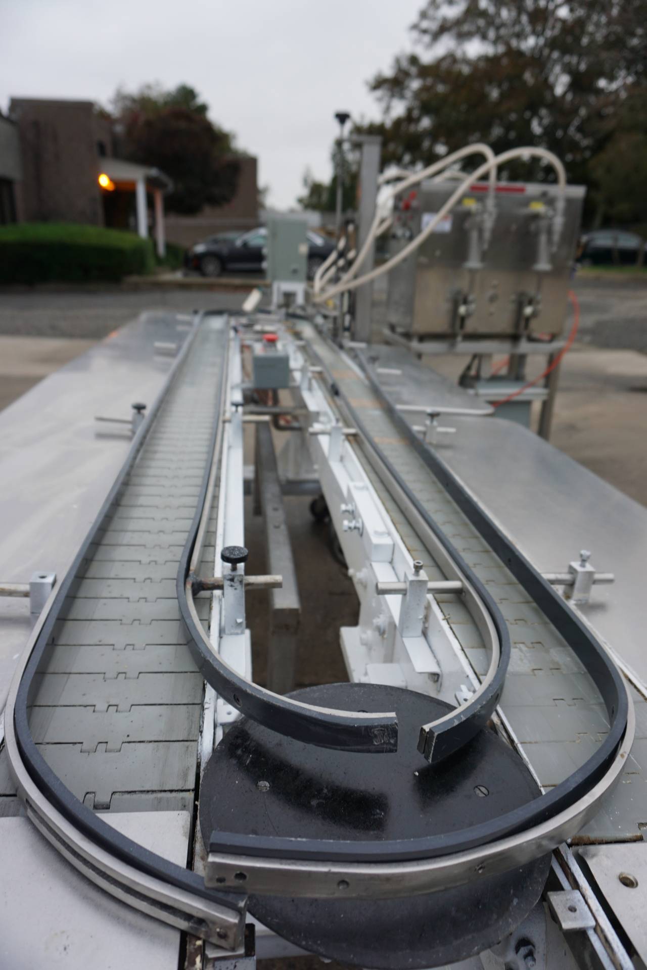 1-Used Filling Equipment Company Four Head Piston Filling Machine. Mounted on “carousel” style conveyor, machine has 5 In. Wide plastic tabletop conveyor chain with side work tables. Equipped with air indexing cylinders for timing fill cycle, overall length of machine is about 140 In. (Stock #8433)