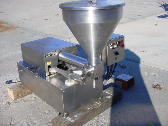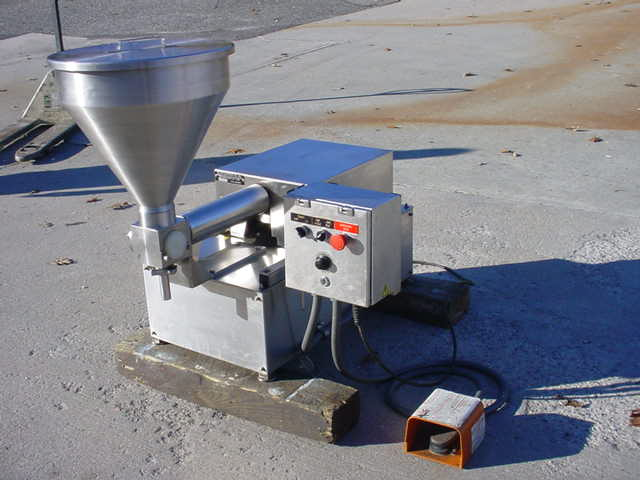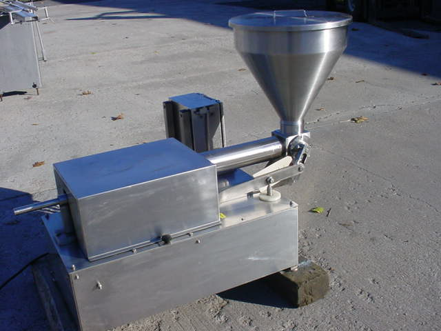 1-USED FILLING EQUIPMENT COMPANY SINGLE PISTON TABLETOP FILLING MACHINE, S/N 95278-170. EQUIPPED WITH APPROX. 3" DIAMETER X 12" LONG STAINLESS STEEL PISTON/CYLINDER. MACHINE IS RATED UP TO 20 FILLS PER MINUTE. WITH APPROX. 16" DIAMETER CONICAL PRODUCT HOPPER WITH LID, FILLER HAS STAINLESS STEEL CONTROL BOX AND FOOT SWITCH FOR ACTIVATING FILLING CYCLE. SINGLE PHASE, 60 CYCLE ELECTRICS. (STOCK #7426D)
