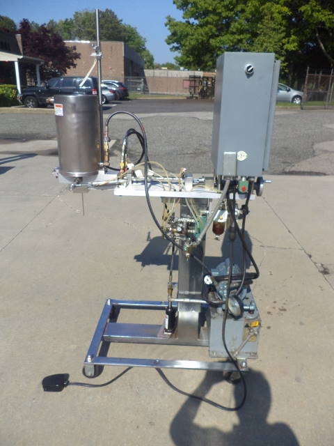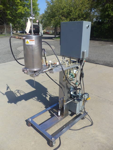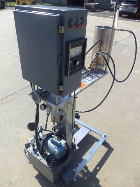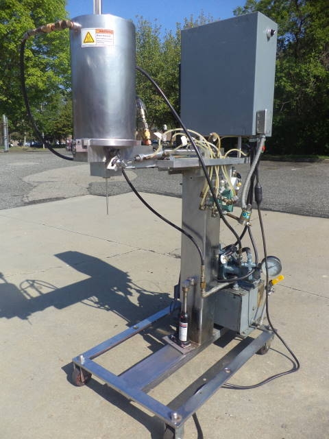 1-Used Hercules Model MC-1 Air Operated Single Piston Filler, S/N 75-MC1-111. This filler has self-contained heating capability for filling of products that require hot filling. With stainless steel jacketed hopper, filler has Delta Power hydraulic power pack and jacketed filling area so that filled product remains heated during the entire filling process. Filler has foot switch for activating filling cycle and Fenwall control panel (Stock #8005S)