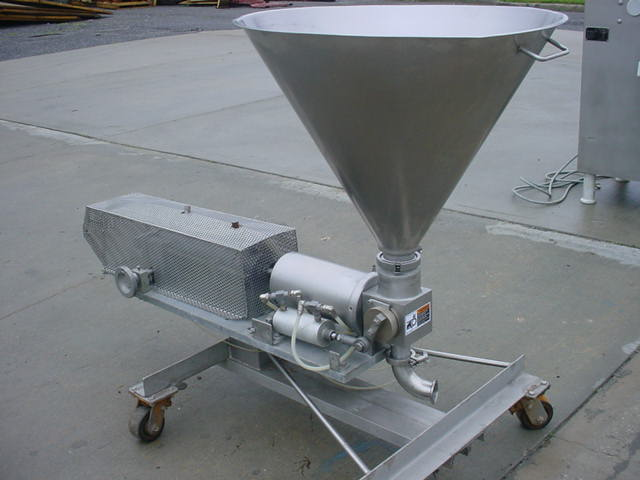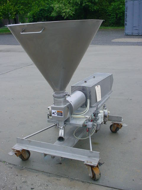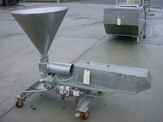 1-USED SINGLE PISTON AIR OPERATED DEPOSITOR/PUMP STATION. MOUNTED ON “LOW PROFILE” PORTABLE STAND WITH CASTERS, UNIT HAS APPROX. 28″ DIAMETER STAINLESS STEEL CONICAL PRODUCT HOPPER AND APPROX. 6″ DIAMETER x 12″ LONG ADJUSTABLE PISTON/CYLINDER COMBINATION. LAST FILLING MISCELLANEOUS FOOD PRODUCTS UP TO 1 GALLON CAPACITY.