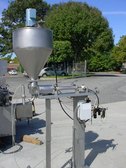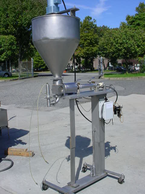 1-Used hinds bock model sp-64 single piston air operated filling machine/depositor, s/n 931. Equipped with stainless steel adjustable piston/cylinder combination measuring approx. 5″ diameter x 7-3/4″ long. On casters for portability, filler has approx. 22″ diameter stainless steel conical product hopper with sweep agitator driven by fractional horsepower motor.