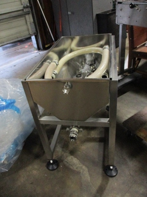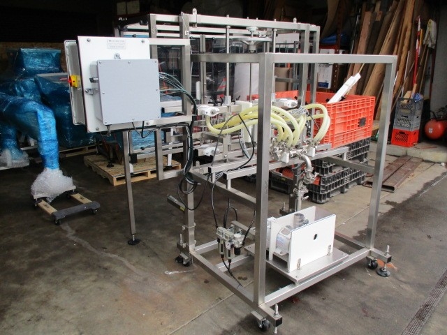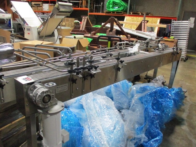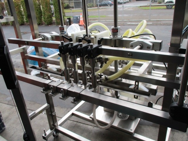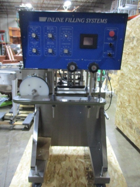 1-Used Inline Filling Systems Stainless Steel Automatic Overflow Filling System. Primarily consisting of 4-spout straight line filler with positive displacement pump, Inline Filling Systems cap tightener/retorquer and rotary unscrambling/accumulating table. Equipped with numerous change parts including for 32 ounce, 20 ounce, 16 ounce, 4 ounce size bottles. (Stock #L1324)