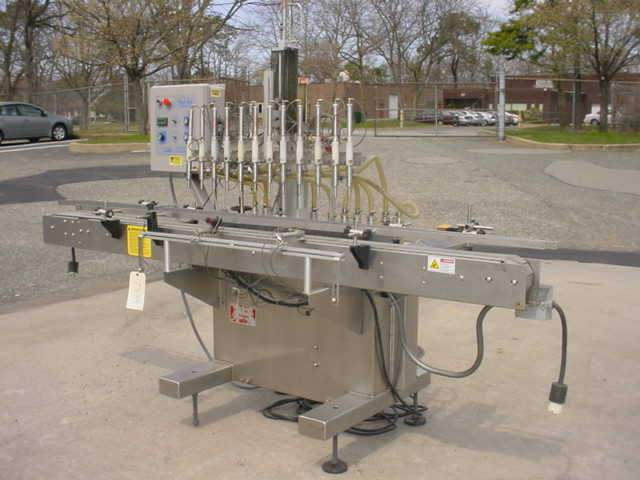 1-Used kaps-all/fills-all vol-32 automatic twelve piston stainless steel inline filling machine, s/n 3291. Presently equipped with twelve (12) stainless steel pistons. Equipped with micro-processor control box, filler has approx. 8-1/2′ long stainless steel index conveyor with approx. 4-1/2″ wide plastic tabletop chain.