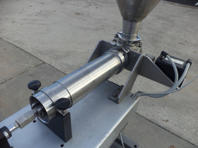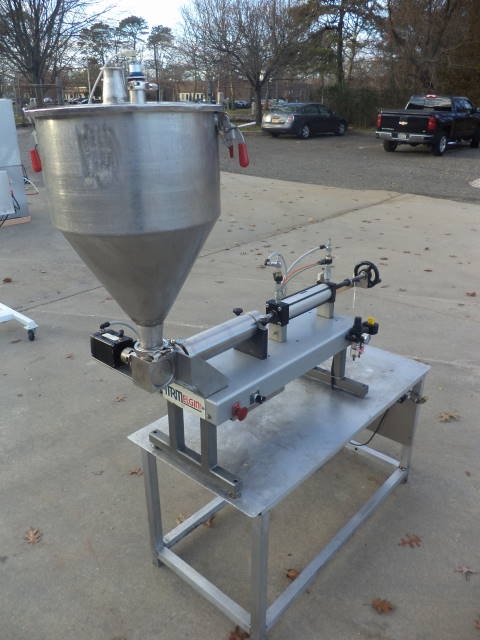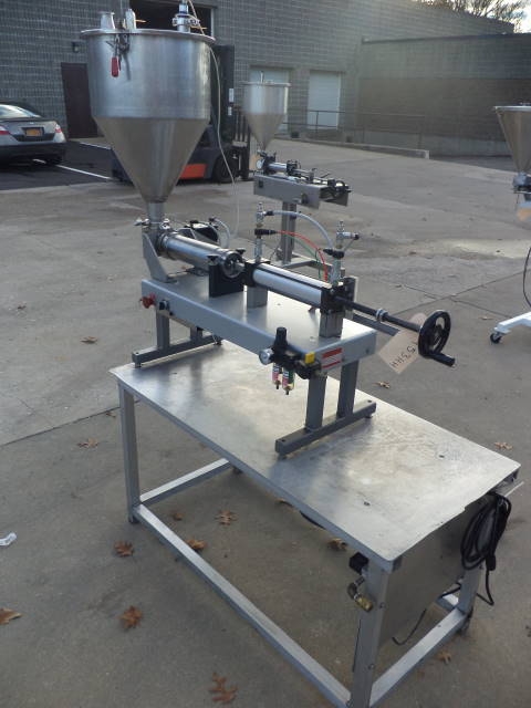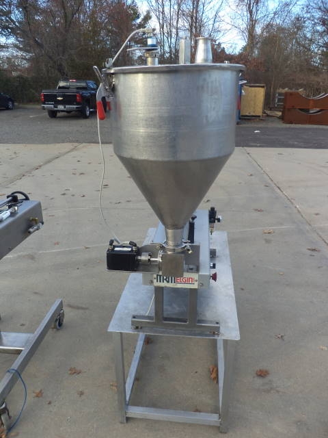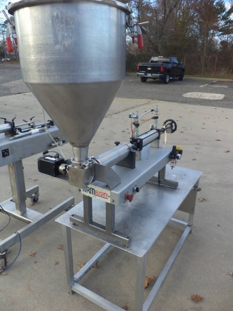 1-Used MRM/ELGIN Single Piston Air Operated Filling Machine, S/N 313. Rated up to 20 fills per minute, Filler currently has approx. 3-1/4 in. diameter X 13 in. long product cylinder (60 oz. maximum fill). Mounted on Table, Filler has top mounted approx. 16 in. diameter conical hopper with lid. (Stock #7953HH)