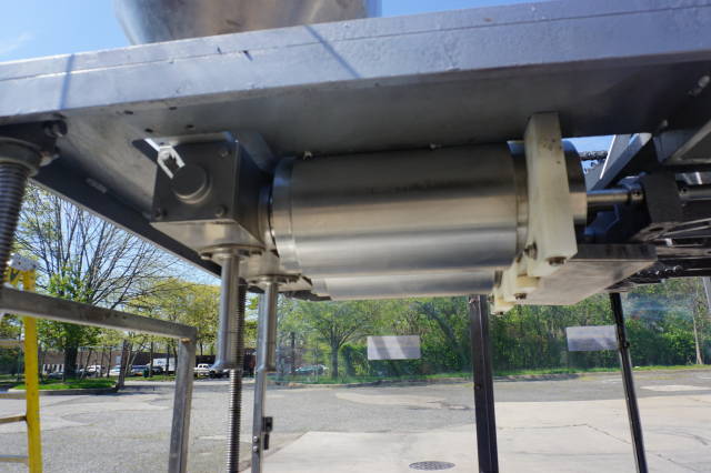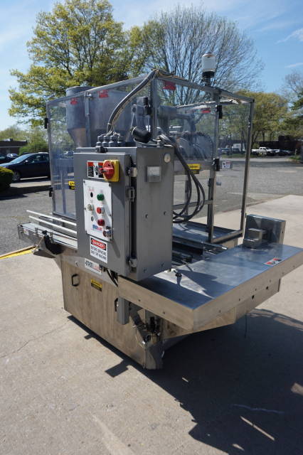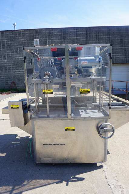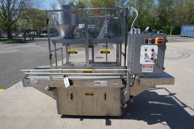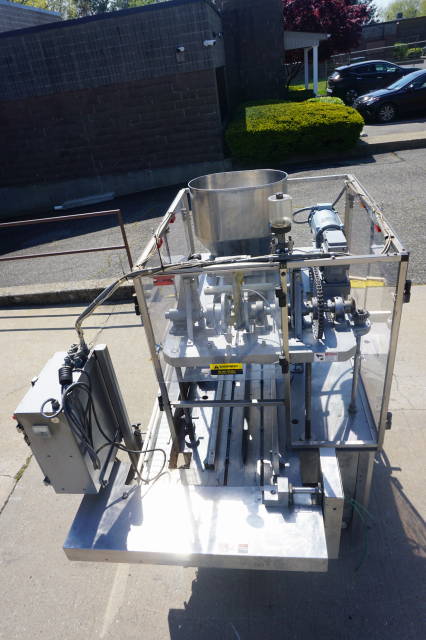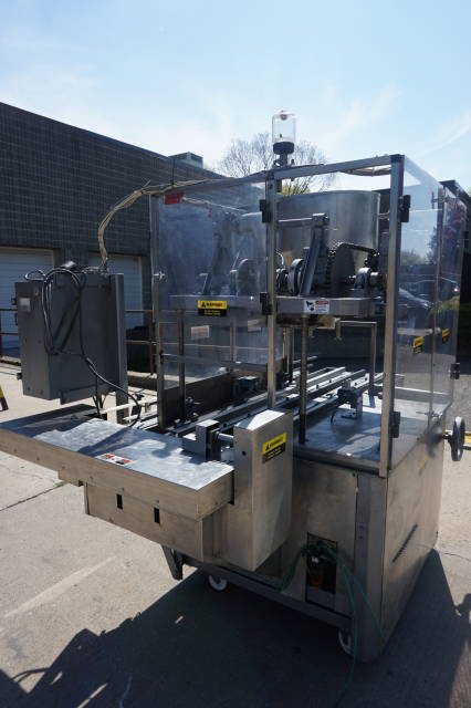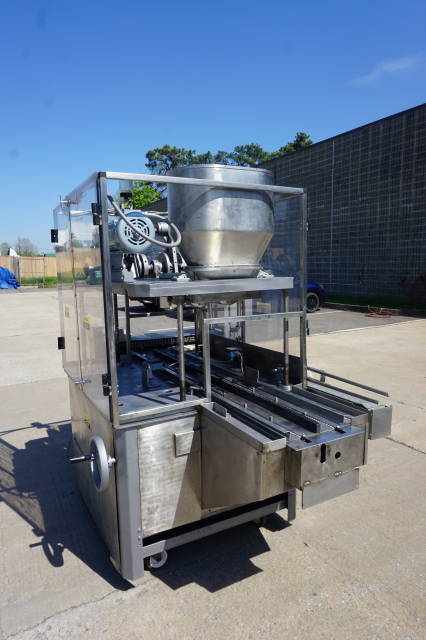 1-Used MRM/Elgin Automatic Twin Head Gallon Piston Filling Machine, S/N TWIN055. Last filling one gallon containers of peanut butter, machine is suitable for filling many different types of products including hand sanitizer, creams, lotions, etc. On casters for portability, filler has “bottom up” filling of containers and top-mounted stainless steel hopper as well as side mounted stainless control panel. Present product cylinders measure approx. 5 ½ In. diameter X 13 ½ In. Long. With approximately 90 inch long stainless steel infeed conveyor with push rods. Electrical specifications 3/60/230 Volt. (Stock #8370)