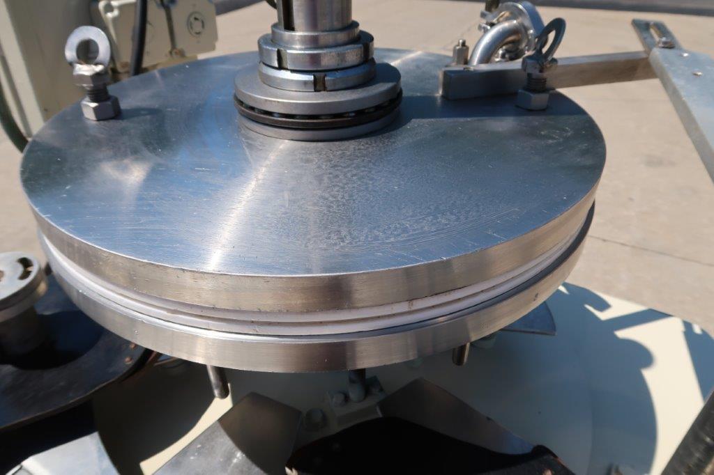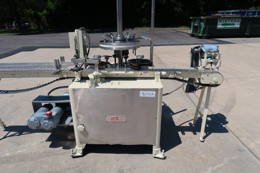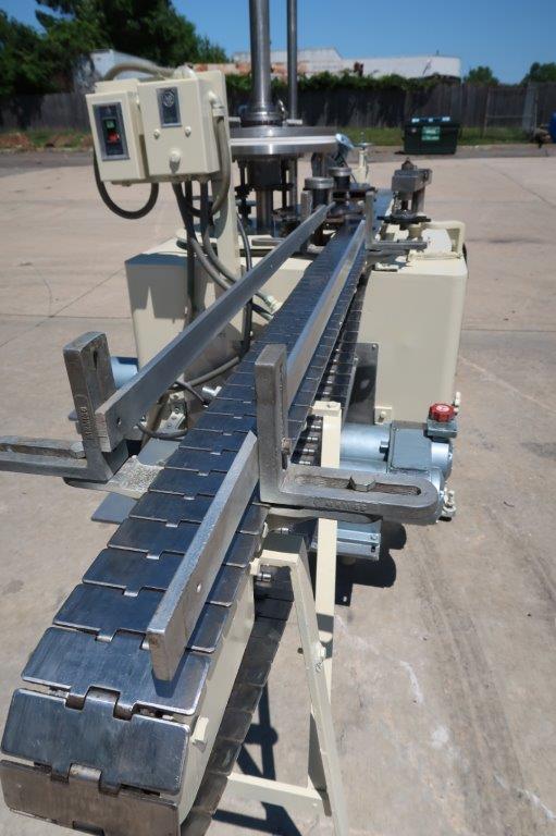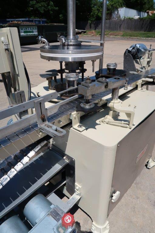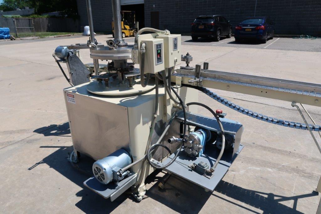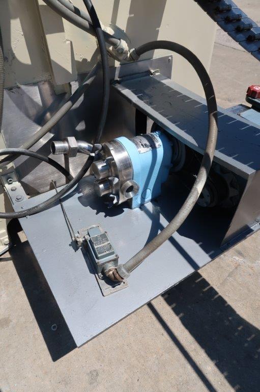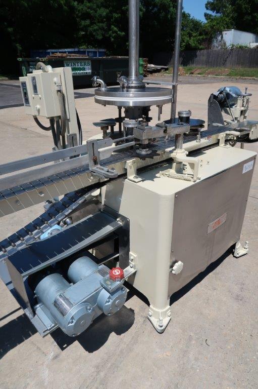 1-Used MRM “Versa-Fil” Six Head Rotary Time and Pressure Positive Displacement Filling Machine, Serial Number 4745. This versatile style filler has an extreme range of capabilities from liquid filling up through peanut butter consistency products, and is equipped with automatic conveyor with tabletop chain. Equipped with stainless steel and Teflon contact parts, filler has Waukesha Size 10 product feed pump with Variable speed drive mounted on same base. With rising platforms, machine has 8 In. centers “spout to spout”. (Stock #8658A)