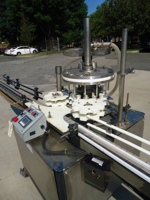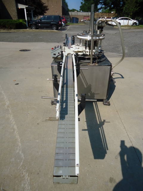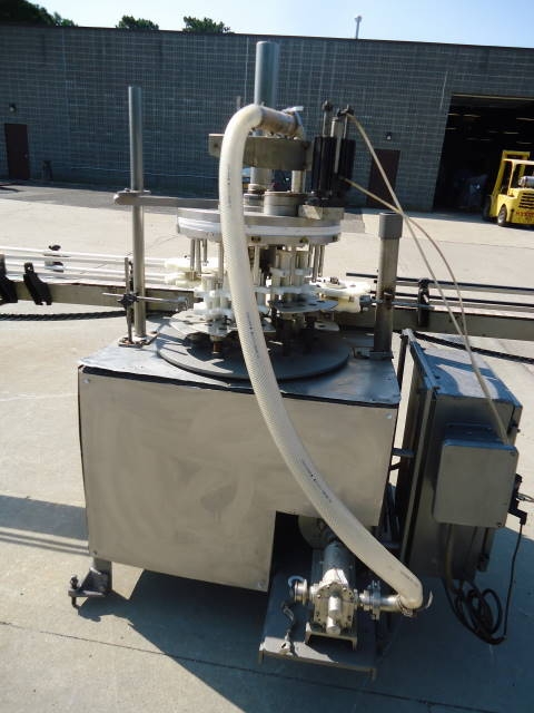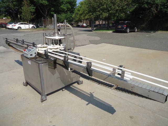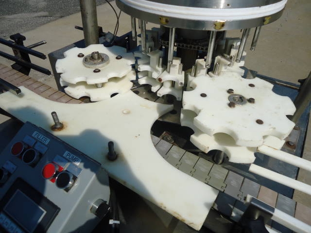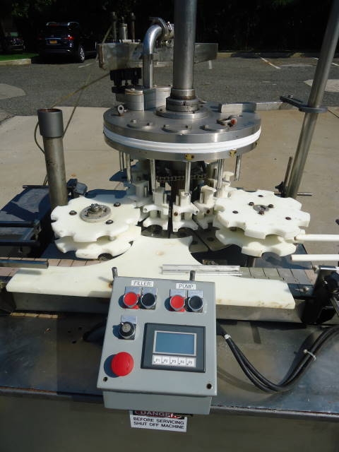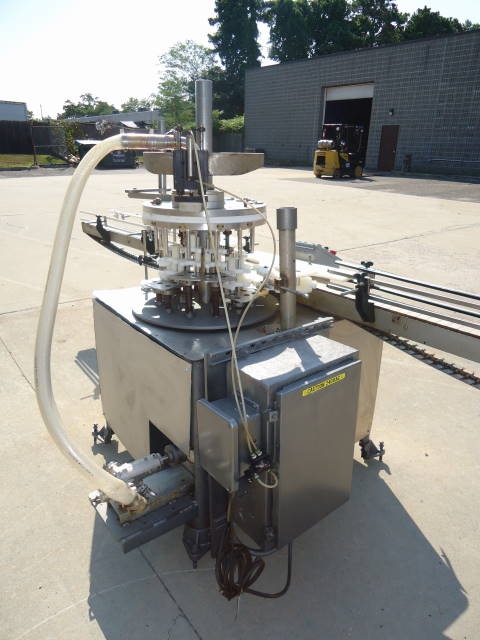 1-Used MRM “Versafil” Twelve Spout Rotary Positive Displacement Filler. Equipped with approx. 4 in. centers, spout to spout. Filler has rising platforms and is equipped with Dayton stainless steel rotary gear feed pump and has infeed/discharge stars. Can be supplied with conveyor at additional cost (not conveyor shown in photos.) Stock #7812P