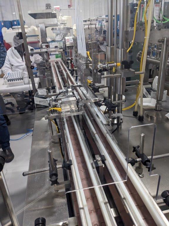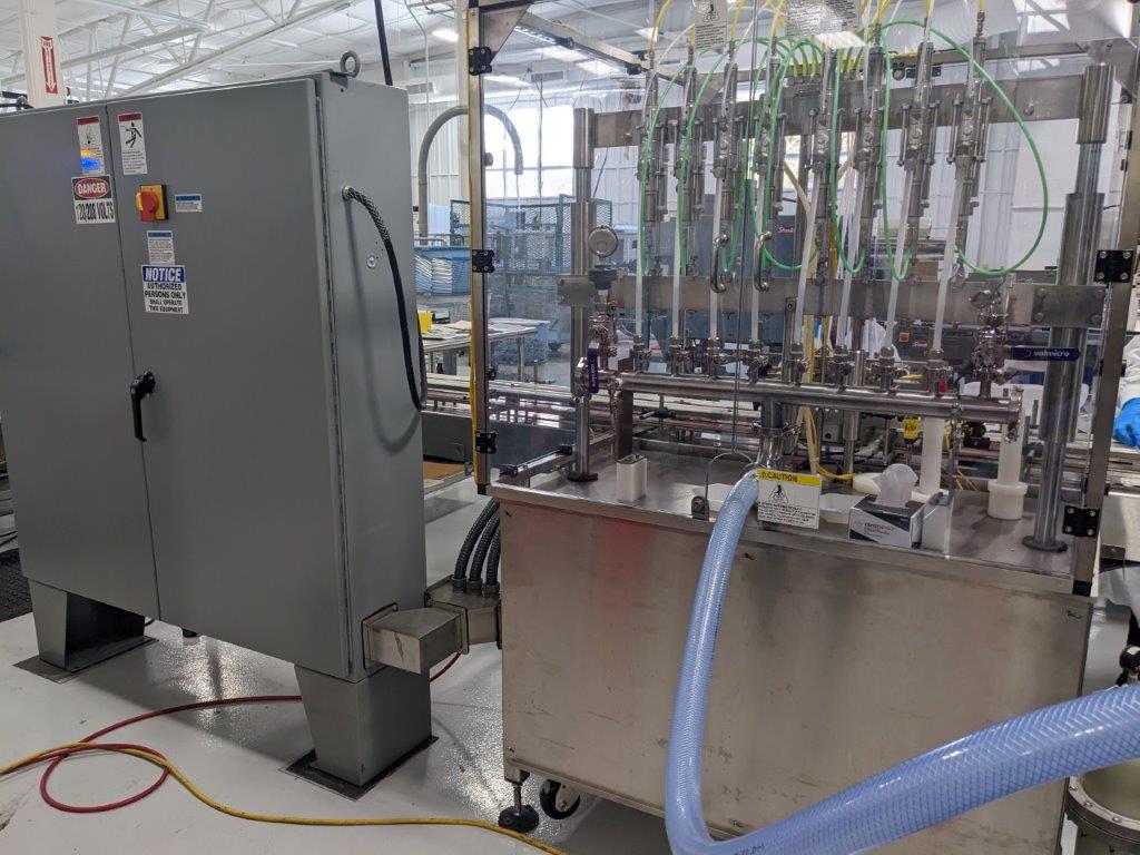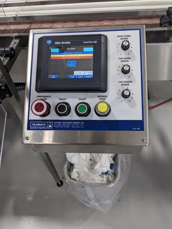 1- Used National Instrument Company Filamatic 10 Piston Inline Automatic Sanitary Piston Filling and Capping Machine, Serial Number 021447. Last used for filling pharmaceutical “pen style” bottles, filler has approximately 17 Ft. long return “recycling” conveyor with dual plastic tabletop chain and pneumatic cylinders for synchronizing containers. Presently equipped with eight (8) nozzles, machine can easily be complete with 2 additional nozzles if required, at additional cost. Equipped with two bowl feeders and a “press-fit” capping station, machine has floor standing electrical panel. Also with Allen-Bradley PanelView 600 front-mounted control panel featuring variable speed controls. Filler has 3/60/208 Volt electrics. Filler also has elevator for delivering product to one of the bowl feeders. Ideal for filling epipen and other small vial/container sizes(Stock #L1440)