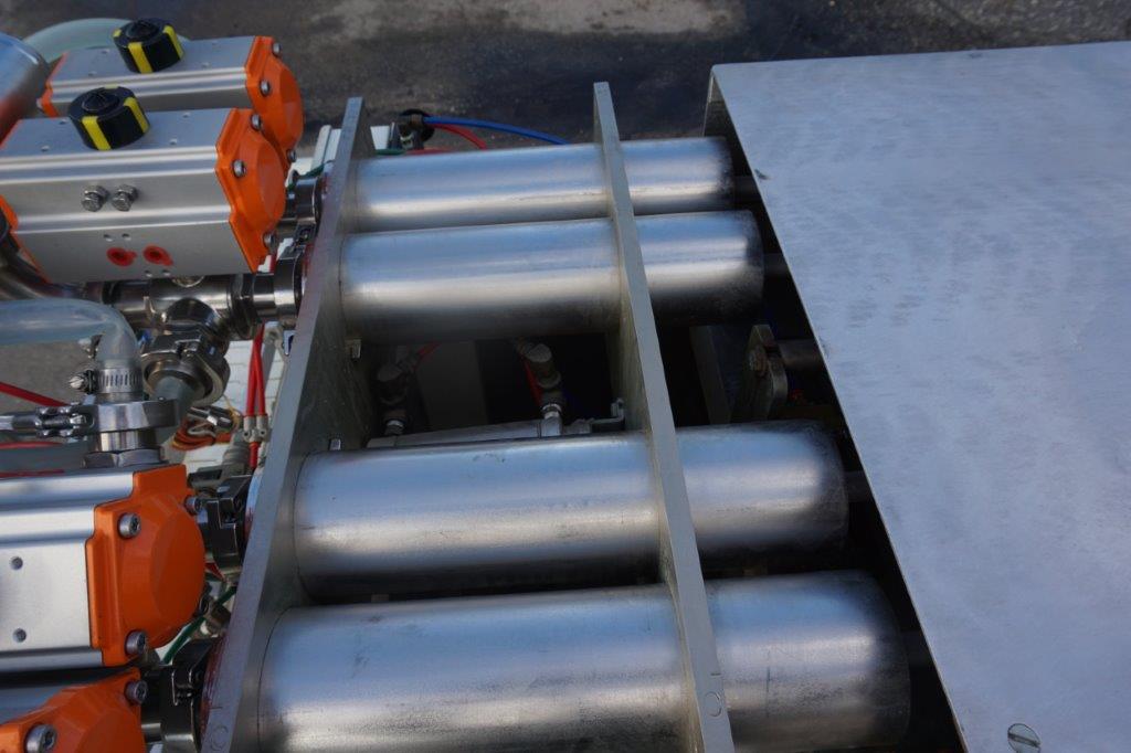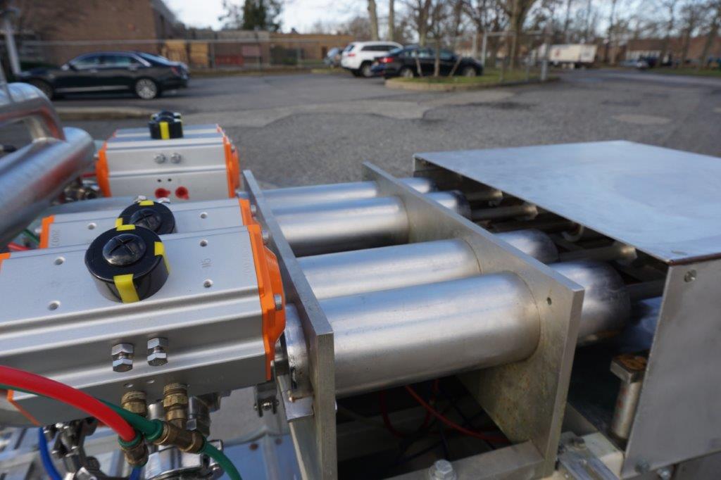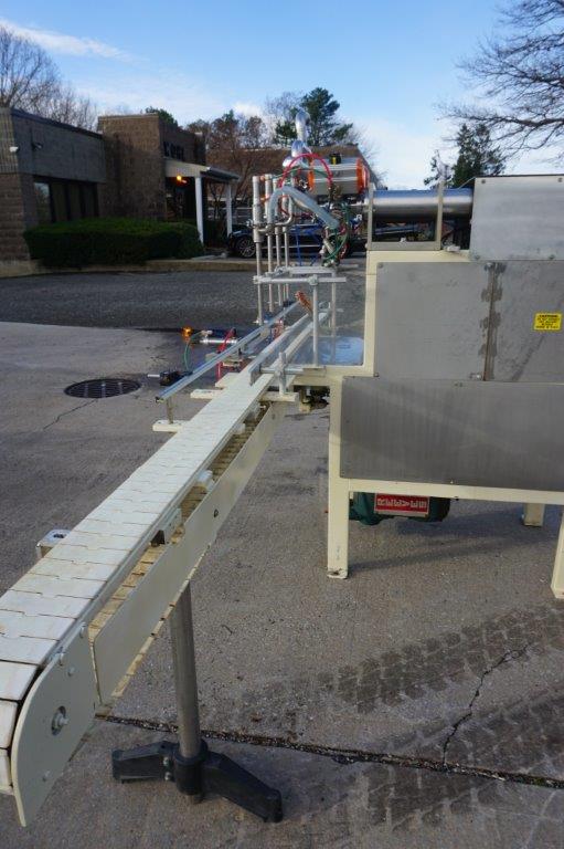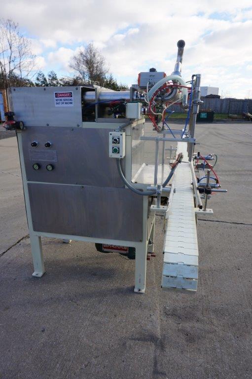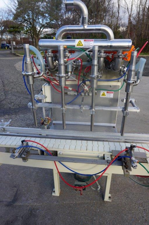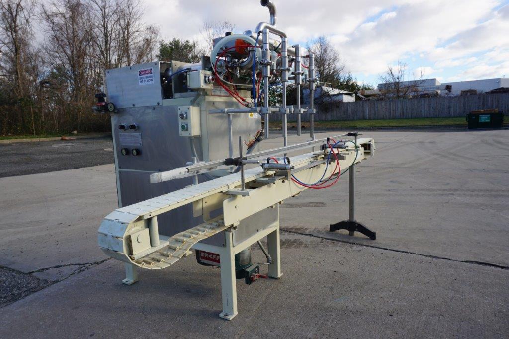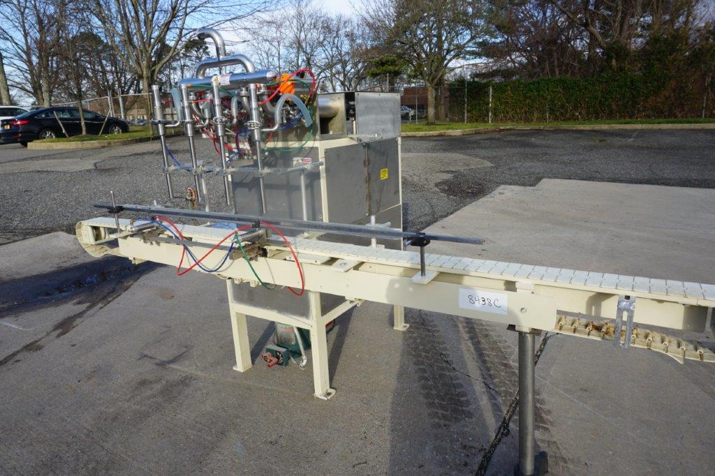 1-Used PackWest 4 Cylinder Piston Filling Machine, S/N 4B-PF-SV-1002. Rated up to 80 containers per minute (speed dependent on viscosity and size of containers), Filler has four (4) approx. 3 in. diameter X 12 in. long pistons. Conveyor measures approx. 112 in. long and is equipped with air indexing cylinders and an approx. 4-1/2 in. wide plastic tabletop chain. Presently equipped with four (4) approx. 3/4 in. diameter nozzles, Filler has stainless steel manifold and is on casters for portability. (Stock # 8438C)