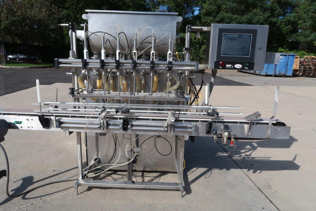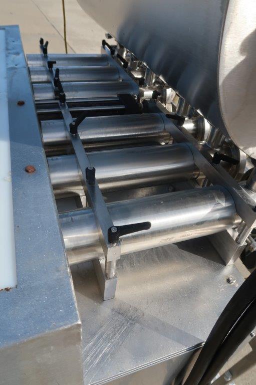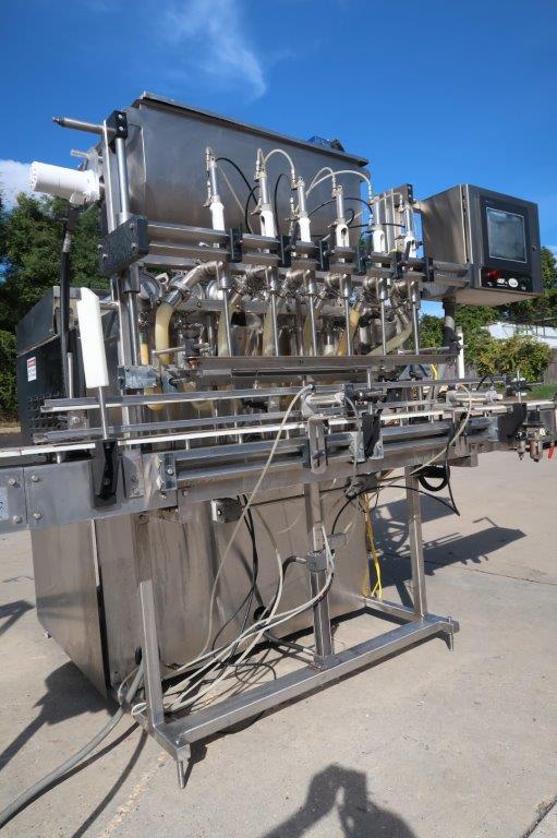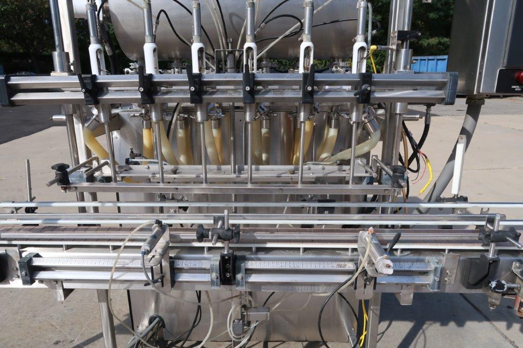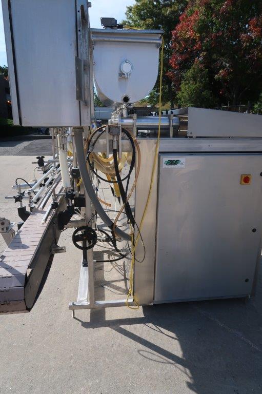 1- Used REB Six (6) Head Fully Automatic Inline Piston Filling Machine, Model IVS-4 EX6, S/N 0638. Last used in the food industry, filler is equipped with six(6) approx. 3 In. diameter X 12 In. long pistons. With top mounted product hopper with paddle agitator and lid, filler has programmable logic controller (PLC). Equipped with approx. 10 Ft. long motorized conveyor, with 4-1/2 In. wide plastic tabletop conveyor chain. (Stock # 8564A)