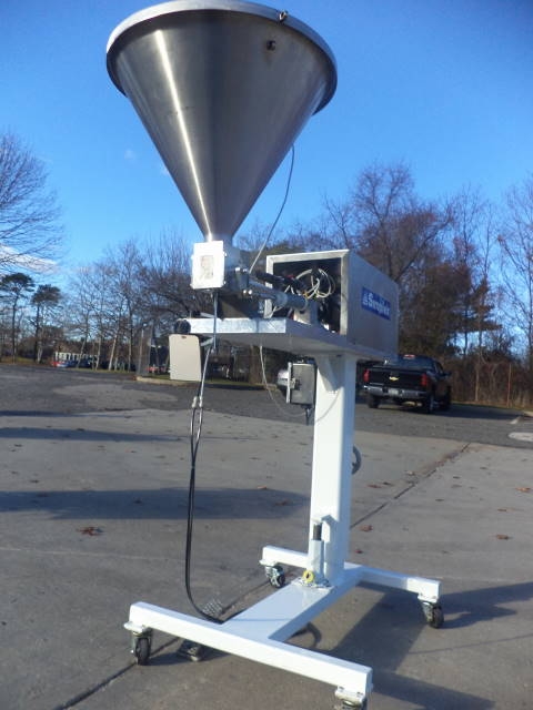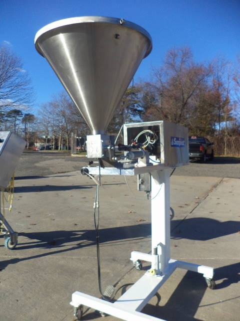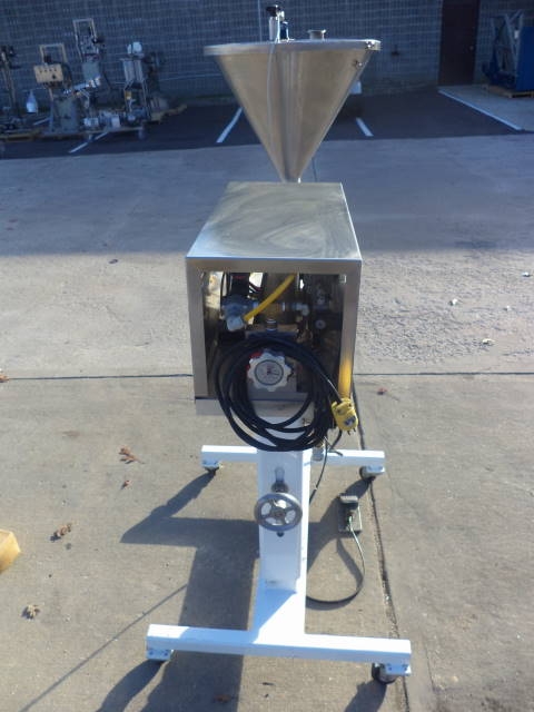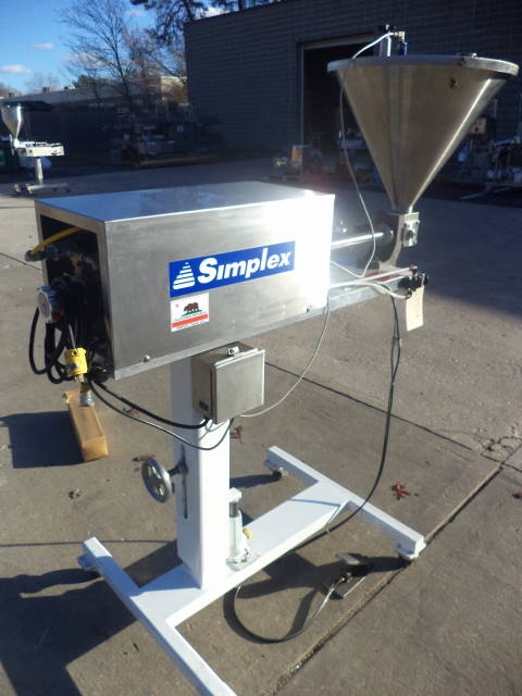 1-Used Simplex Model AV-100 Single Piston Filler, S/N 8063. Rated up to 25 fills per minute, this Air Operated Filler is presently equipped with approx. 1-3/8 in. diameter X 17-1/4 in. long product cylinder (approx. 14 oz. maximum fill). Can be supplied with extra filling cylinders of approx. 4-1/4 in. diameter X 17 in. long (133 oz. maximum fill) at additional charge. On portable stand with casters, this foot switch activated Piston Filler has approx. 21 in. diameter conical hopper with lid and was previously used in the pharmaceutical industry. (Stock #7953K)