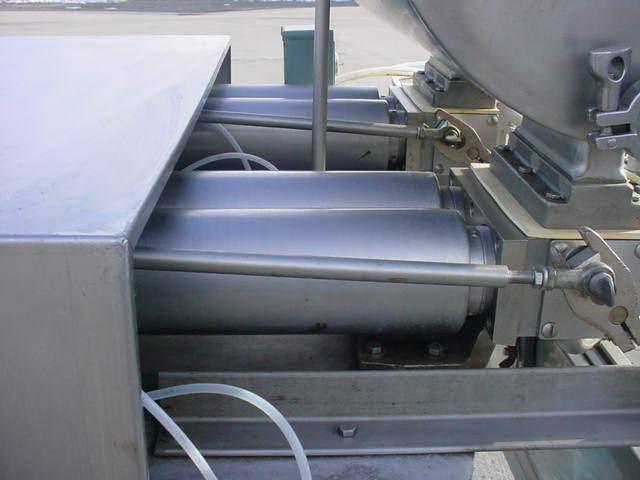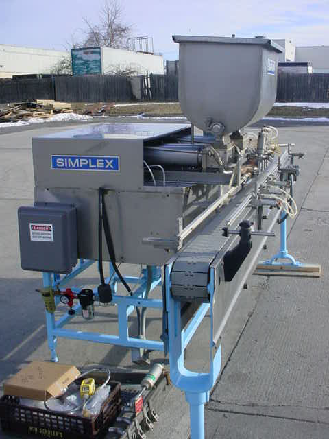 1-Used simplex “dual t” four piston automatic filling machine, s/n 3116. Rated up to 80 containers per minute, machine is currently equipped with approximately 4″ diameter x 13″ long adjustable filling pistons. With top mounted approx. 16″ wide x 30″ long x 18″ deep product hopper with lid, filler has approx. 10′ long stainless steel indexing conveyor with plastic tabletop chain and adjustable speed drive.